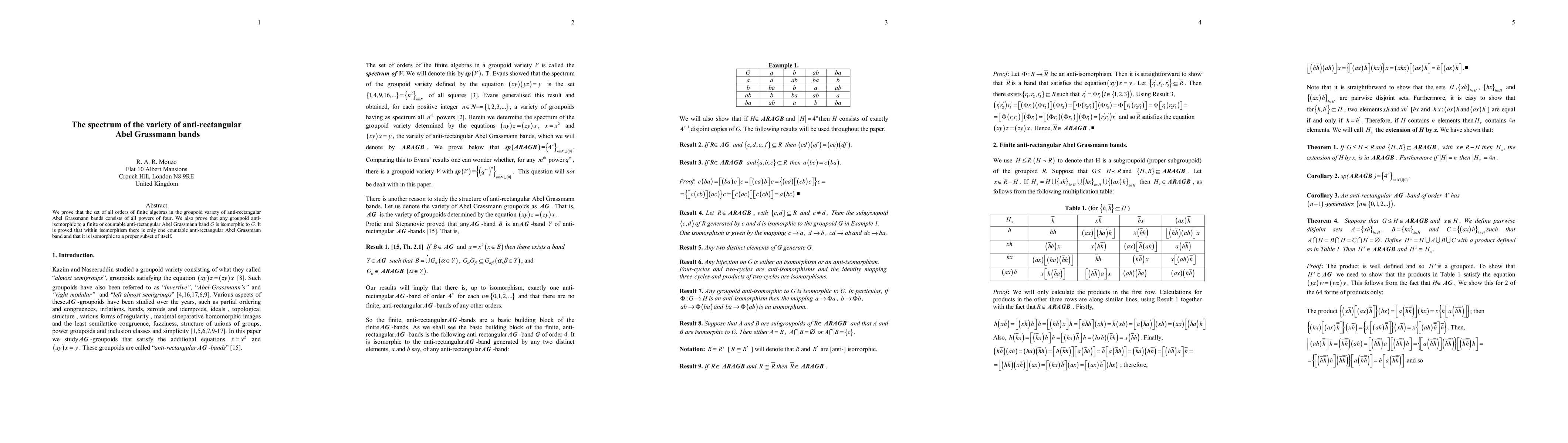 We prove that the set of all orders of finite algebras in the groupoid variety of anti-rectangular Abel Grassmann bands consists of all powers of four. We also prove that any groupoid anti-isomorphic to a finite or countable anti-rectangular Abel Grassmann band G is isomorphic to G. It is proved that within isomorphism there is only one countable anti-rectangular Abel Grassmann band and that it is isomophic to a proper subgroupoid of itself.