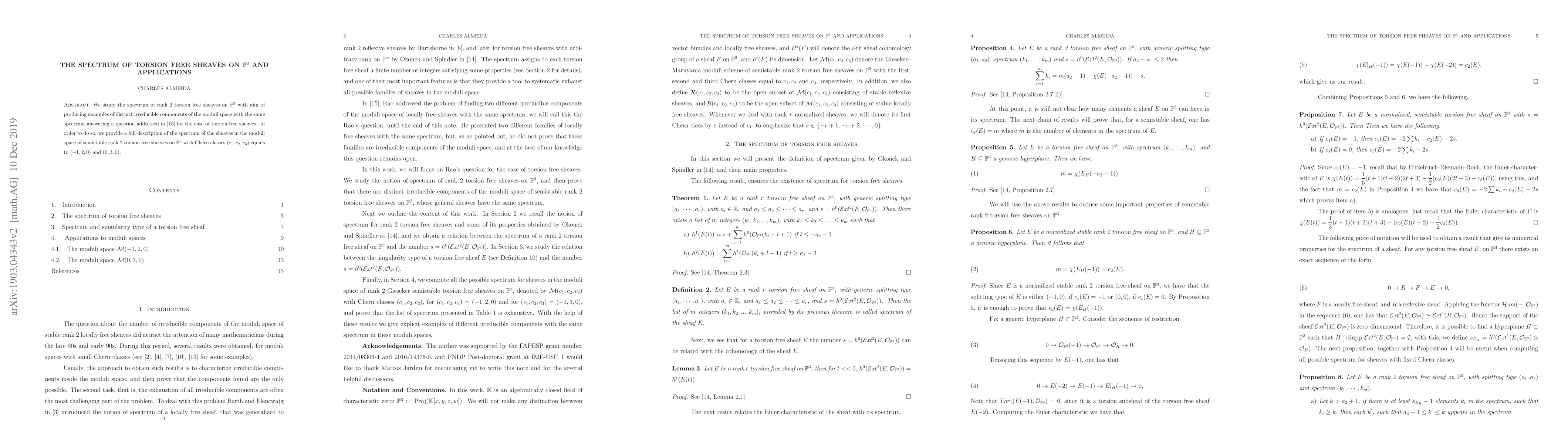 We study the spectrum of rank $2$ torsion free sheaves on $\mathbb{P}^3$ with aim of producing examples of distinct irreducible components of the moduli space with the same spetrcum answering the question presented by Rao for the case of torsion free sheaves. In order to do so, we provide a full description of the spectrum of the sheaves in the moduli space of semistable rank $2$ torsion free sheaves on $\mathbb{P}^3$ with Chern classes $(c_1, c_2,c_3)$ equals to $(-1,2,0)$ and $(0,3,0)$.