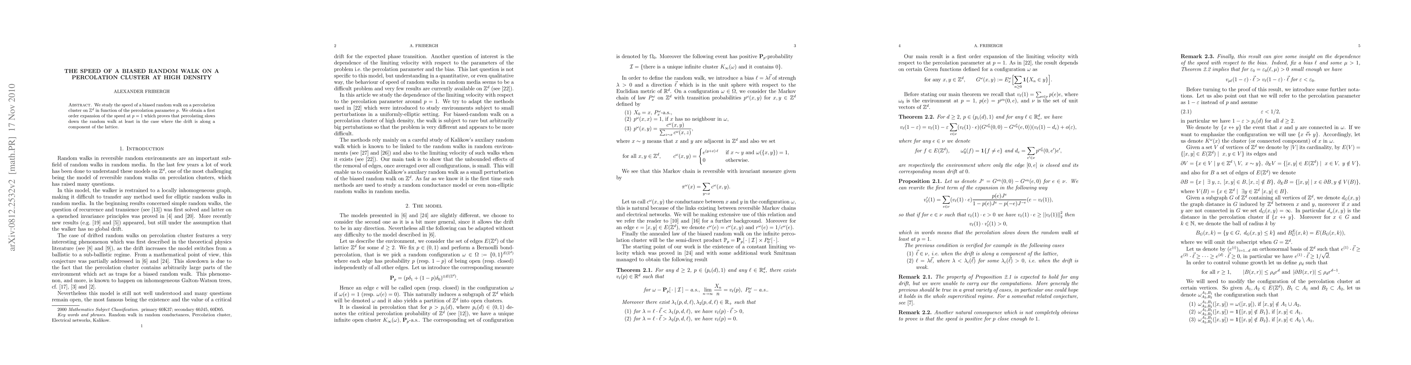 Summary: This paper investigates the speed of a biased random walk on a percolation cluster in high-density conditions, finding that percolation slows down the random walk, especially when the drift aligns with a lattice component, through a first-order expansion at $p=1$.