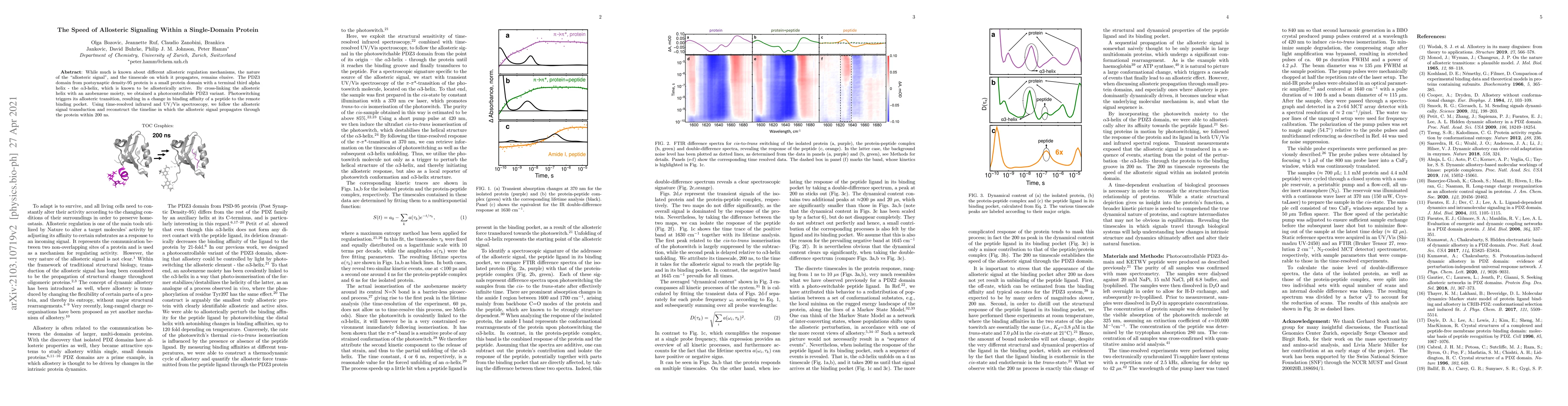 While much is known about different allosteric regulation mechanisms, the nature of the "allosteric signal", and the timescale on which it propagates, remains elusive. The PDZ3 domain from postsynaptic density-95 protein is a small protein domain with a terminal third alpha helix -- the $\alpha$3-helix, which is known to be allosterically active. By cross-linking the allosteric helix with an azobenzene moiety, we obtained a photocontrollable PDZ3 variant. Photoswitching triggers its allosteric transition, resulting in a change in binding affnity of a peptide to the remote binding pocket. Using time-resolved infrared and UV/Vis spectroscopy, we follow the allosteric signal transduction and reconstruct the timeline in which the allosteric signal propagates through the protein within 200 ns.