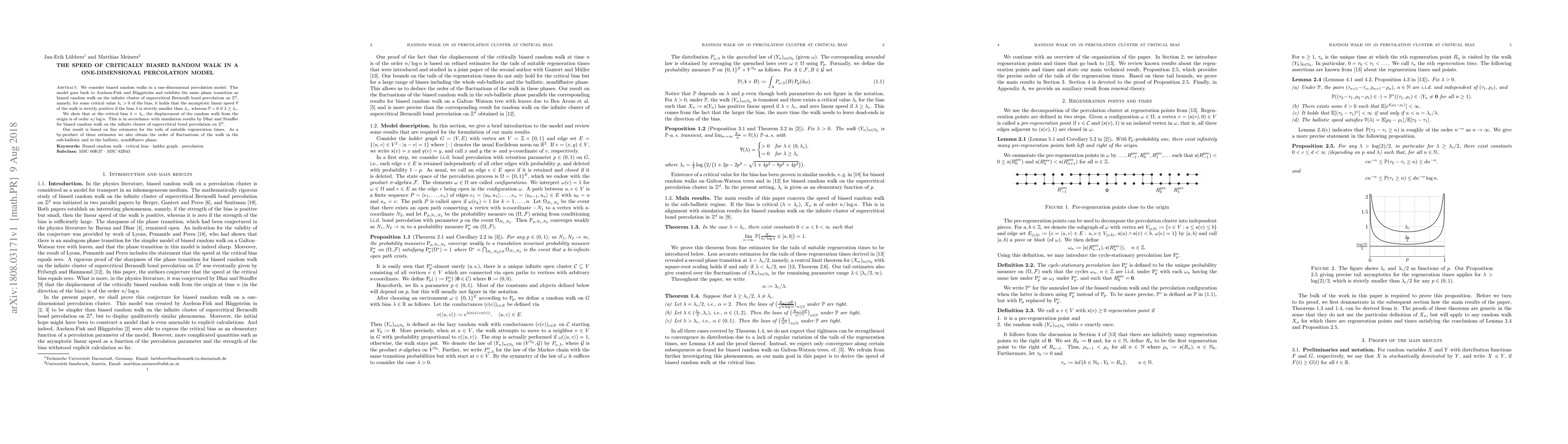 This paper investigates the speed of biased random walks in a one-dimensional percolation model, showing that the walk exhibits a phase transition at a critical bias value $\lambda_{\mathrm{c}}$. At the critical bias, the displacement is of order $n/\log n$, aligning with previous simulation results.