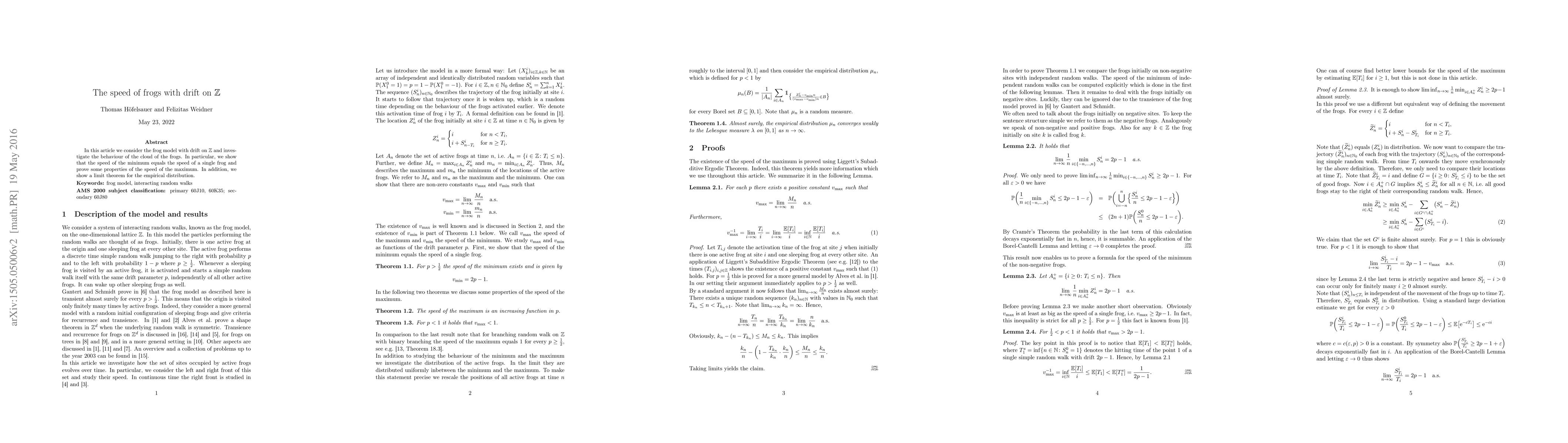 This paper studies the frog model with drift on the integer lattice $\mathbb{Z}$, demonstrating that the speed of the minimum frog equals that of a single frog and proving properties of the maximum speed. It also provides a limit theorem for the empirical distribution of the frogs.