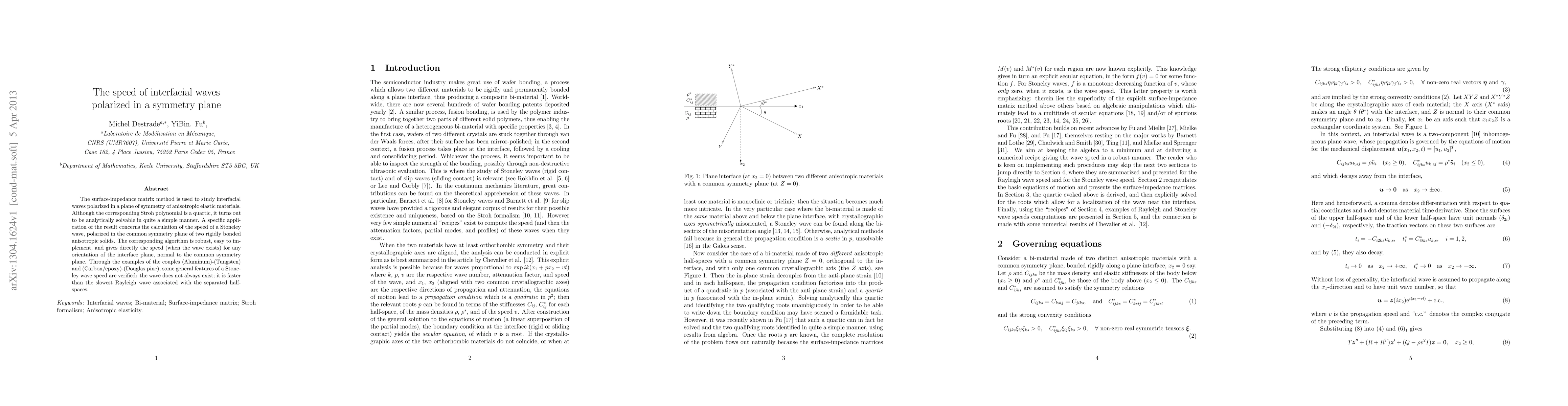 The surface-impedance matrix method is used to study interfacial waves polarized in a plane of symmetry of anisotropic elastic materials. Although the corresponding Stroh polynomial is a quartic, it turns out to be analytically solvable in quite a simple manner. A specific application of the result concerns the calculation of the speed of a Stoneley wave, polarized in the common symmetry plane of two rigidly bonded anisotropic solids. The corresponding algorithm is robust, easy to implement, and gives directly the speed (when the wave exists) for any orientation of the interface plane, normal to the common symmetry plane. Through the examples of the couples (Aluminum)-(Tungsten) and (Carbon/epoxy)-(Douglas pine), some general features of a Stoneley wave speed are verified: the wave does not always exist; it is faster than the slowest Rayleigh wave associated with the separated half-spaces.