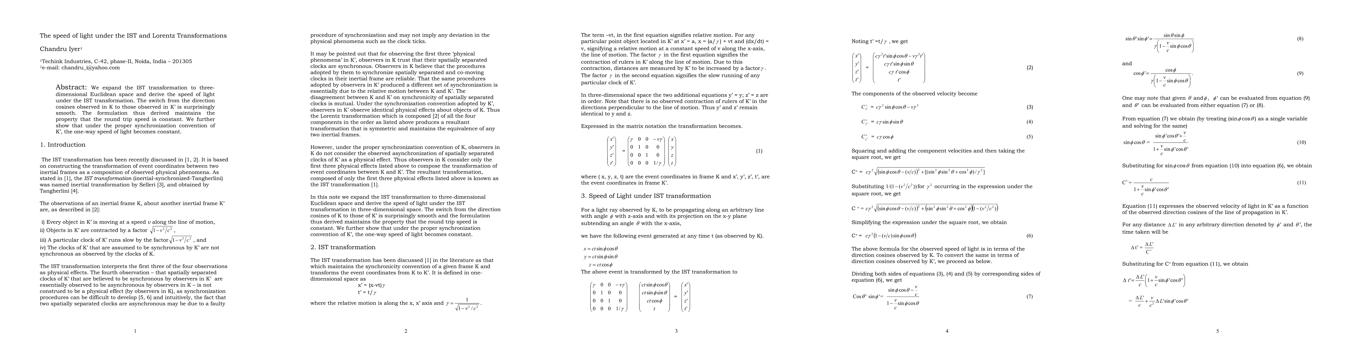 The research paper derives the speed of light under the IST transformation in three-dimensional space, showing that round trip speed remains constant and one-way speed becomes constant when synchronized correctly.