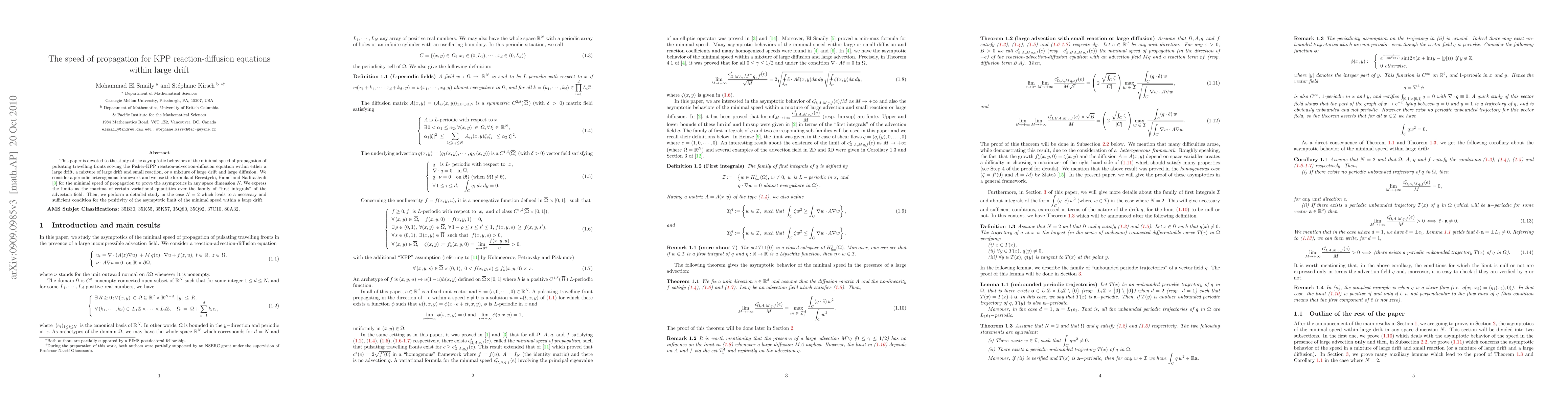 This paper is devoted to the study of the asymptotic behaviors of the minimal speed of propagation of pulsating traveling fronts solving the Fisher-KPP reaction-advection-diffusion equation within either a large drift, a mixture of large drift and small reaction, or a mixture of large drift and large diffusion. We consider a periodic heterogenous framework and we use the formula of Berestycki, Hamel and Nadirashvili \cite{bhn2} for the minimal speed of propagation to prove the asymptotics in any space dimension $N.$ We express the limits as the maxima of certain variational quantities over the family of "first integrals" of the advection field. Then, we perform a detailed study in the case N=2 which leads to a necessary and sufficient condition for the positivity of the asymptotic limit of the minimal speed within a large drift.