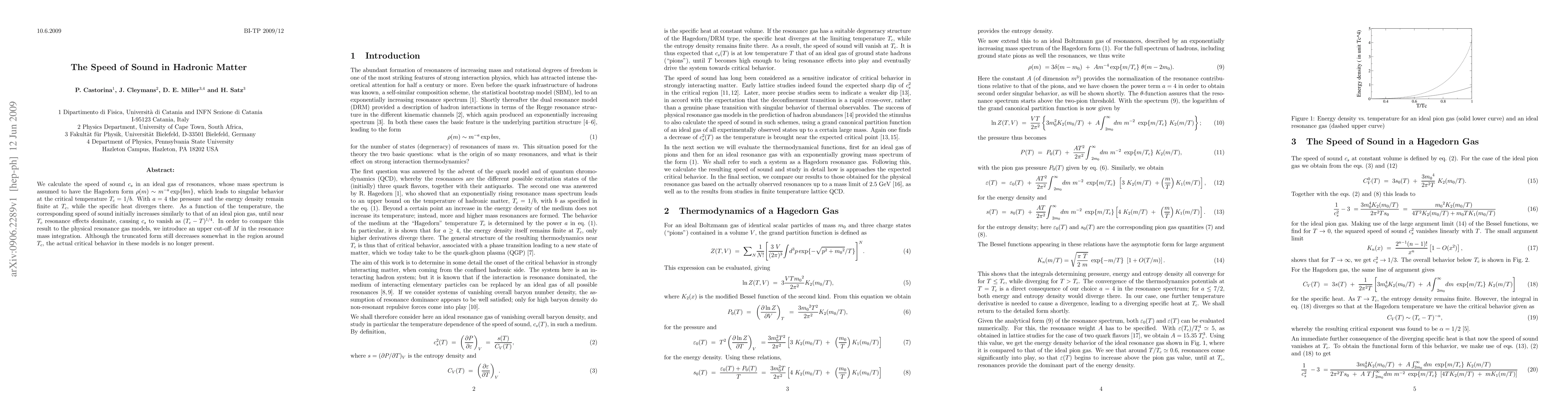 The speed of sound in a hypothetical hadronic matter changes from increasing to vanishing as temperature approaches its critical point, which is determined by the mass spectrum of the resonances. The behavior is influenced by an upper cut-off for the resonance masses.