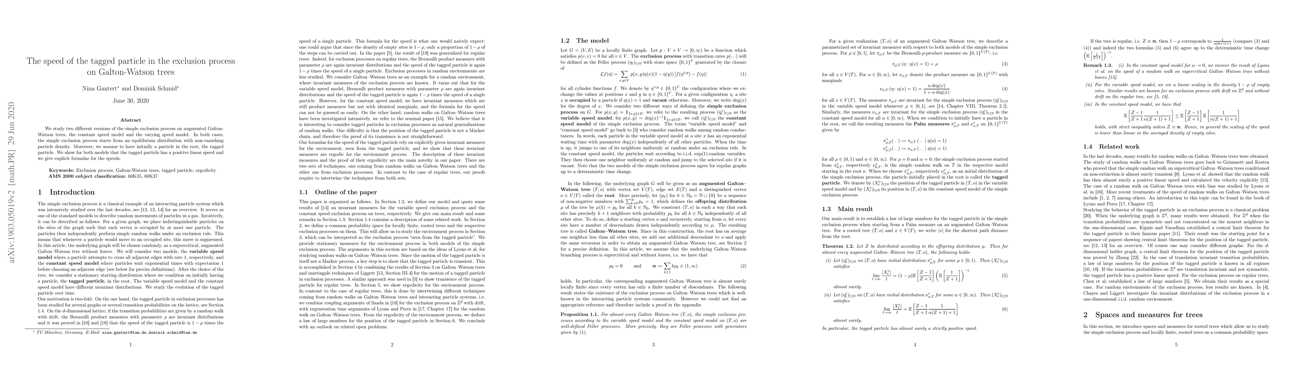 Summary: This paper investigates two versions of the simple exclusion process on Galton-Watson trees, determining that the tagged particle exhibits a positive linear speed in both models. Explicit formulas for the tagged particle's speed are provided for both constant and varying speed models.