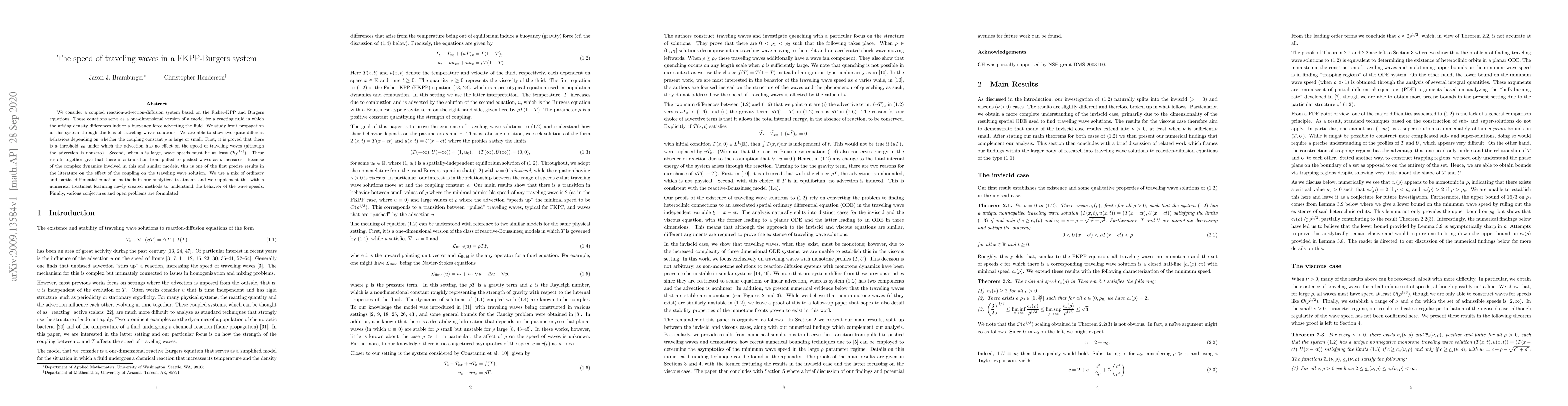 We consider a coupled reaction-advection-diffusion system based on the Fisher-KPP and Burgers equations. These equations serve as a one-dimensional version of a model for a reacting fluid in which the arising density differences induce a buoyancy force advecting the fluid. We study front propagation in this system through the lens of traveling waves solutions. We are able to show two quite different behaviors depending on whether the coupling constant $\rho$ is large or small. First, it is proved that there is a threshold $\rho_0$ under which the advection has no effect on the speed of traveling waves (although the advection is nonzero). Second, when $\rho$ is large, wave speeds must be at least $\mathcal{O}(\rho^{1/3})$. These results together give that there is a transition from pulled to pushed waves as $\rho$ increases. Because of the complex dynamics involved in this and similar models, this is one of the first precise results in the literature on the effect of the coupling on the traveling wave solution. We use a mix of ordinary and partial differential equation methods in our analytical treatment, and we supplement this with a numerical treatment featuring newly created methods to understand the behavior of the wave speeds. Finally, various conjectures and open problems are formulated.