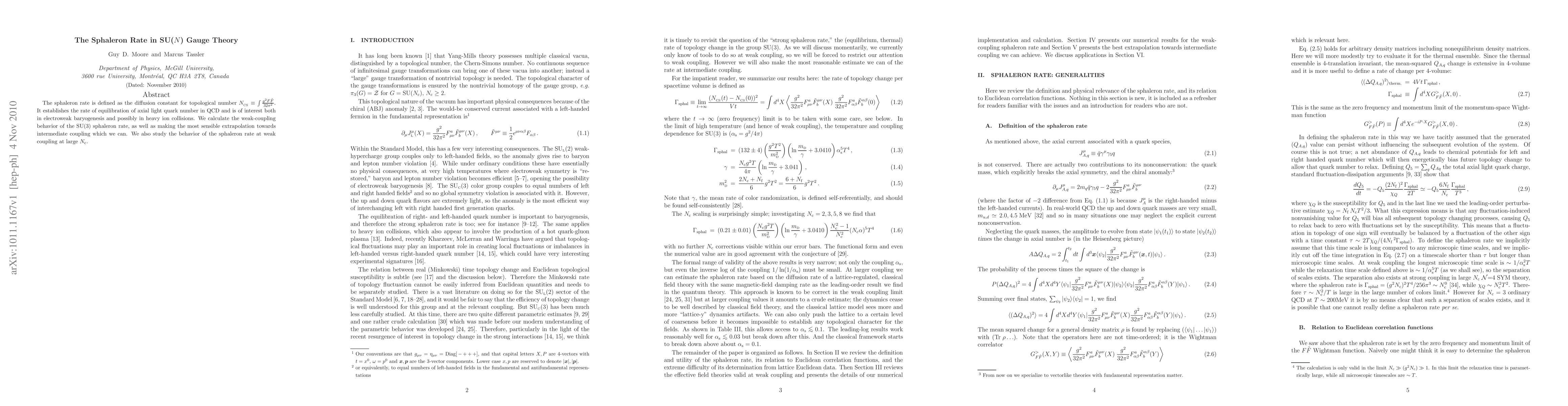 This paper calculates the sphaleron rate, a measure of equilibration of axial light quark number in QCD, for SU(3) gauge theory at weak coupling and extrapolates to intermediate coupling. It also explores the behavior of the sphaleron rate at weak coupling for large Nc.