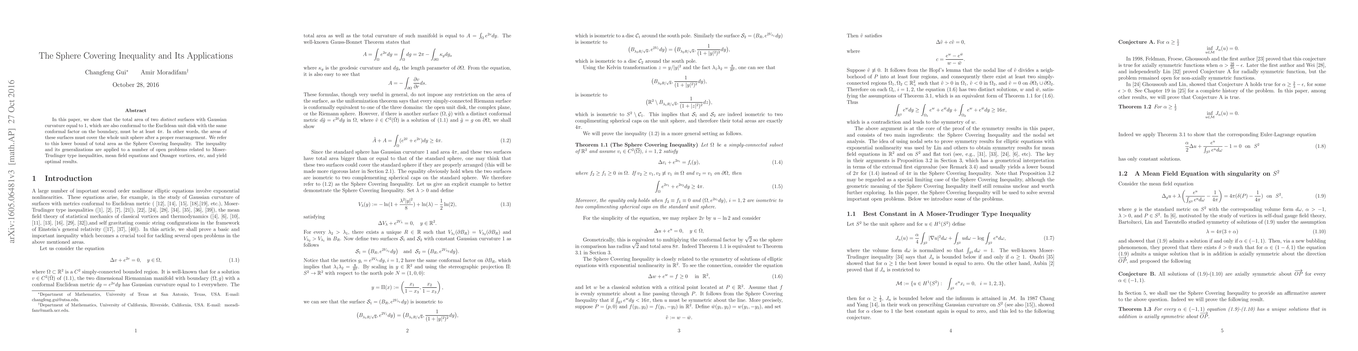 The Sphere Covering Inequality establishes a lower bound of 4π for the total area of two distinct surfaces with Gaussian curvature of 1, conformally mapped to the Euclidean unit disk. This inequality is applied to solve various open problems in Moser-Trudinger type inequalities, mean field equations, and Onsager vortices, achieving optimal results.