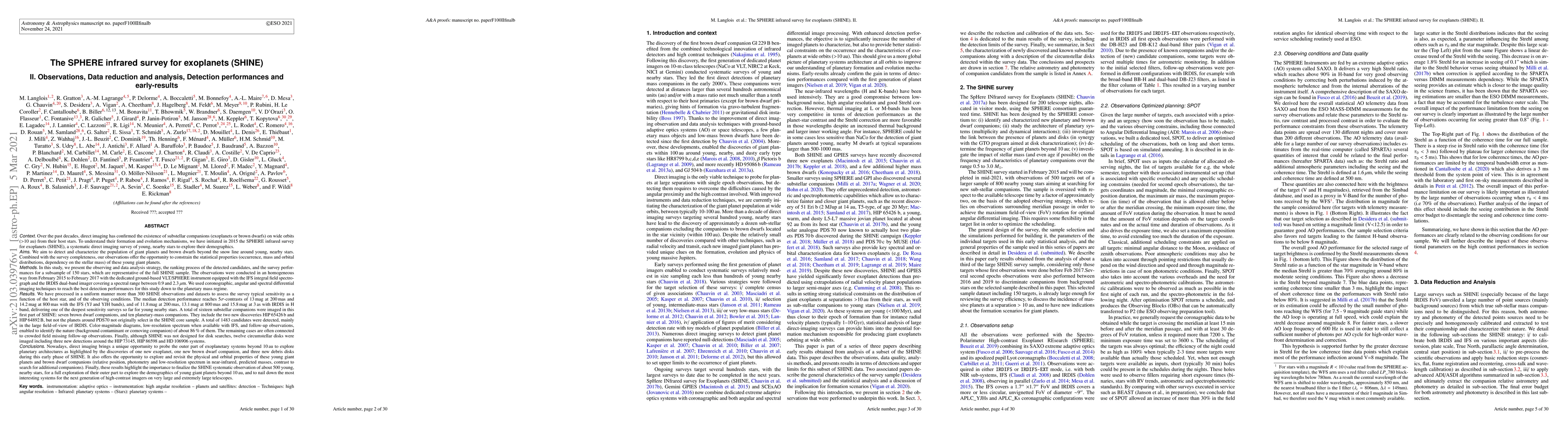 This paper details the SHINE survey's observational strategy, data reduction, and analysis techniques for detecting exoplanets and brown dwarfs using the VLT/SPHERE instrument. The study presents early results from a representative sample of 150 stars, aiming to understand the demographics and statistical properties of young giant planets.