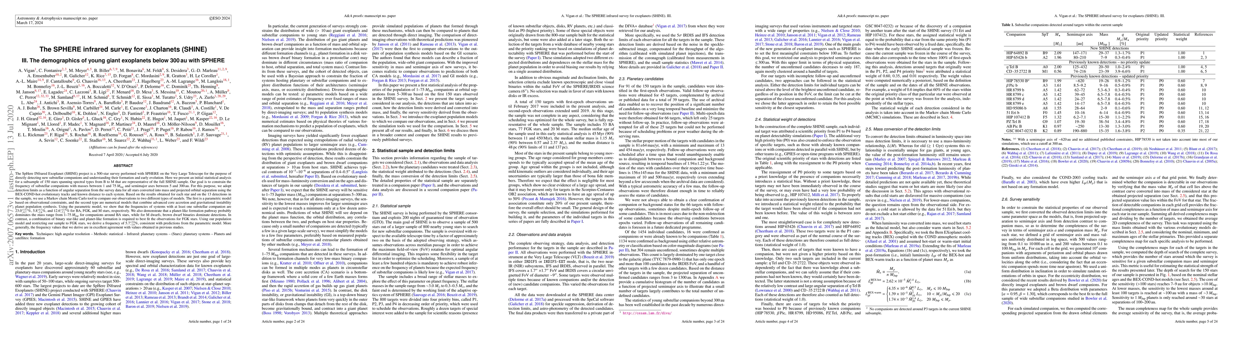 The SHINE project surveys 500 stars for substellar companions using SPHERE on the VLT, focusing on the demographics of young giant exoplanets. Initial results from 150 representative stars suggest frequencies of substellar companions around BA, FGK, and M stars are 23%, 6%, and 13%, respectively, with planet-like formation dominating for BA stars and binary star-like processes for M dwarfs.