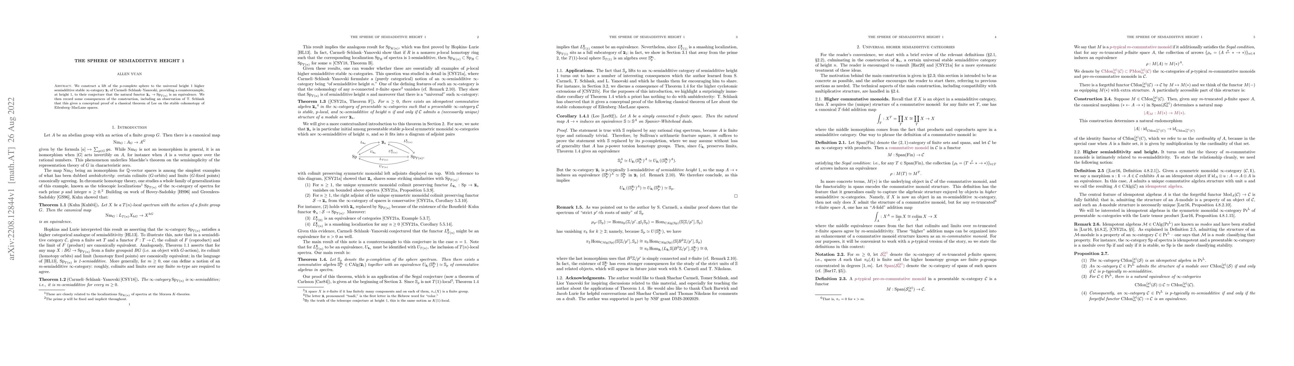 This paper constructs a lift of the $p$-complete sphere to the universal height 1 higher semiadditive stable $\infty$-category, refuting a conjecture by Carmeli--Schlank--Yanovski. It also provides a conceptual proof of Lee's theorem on the stable cohomotopy of Eilenberg--MacLane spaces.