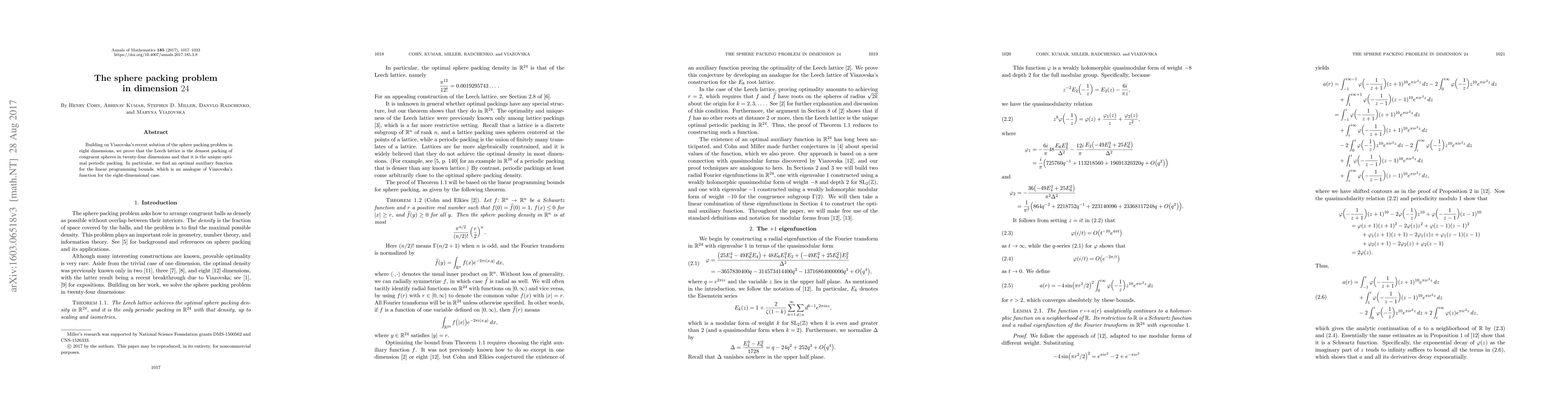 This paper proves that the Leech lattice is the densest packing of congruent spheres in twenty-four dimensions and is the unique optimal periodic packing. It also introduces an optimal auxiliary function for the linear programming bounds, analogous to Viazovska's function for eight dimensions.