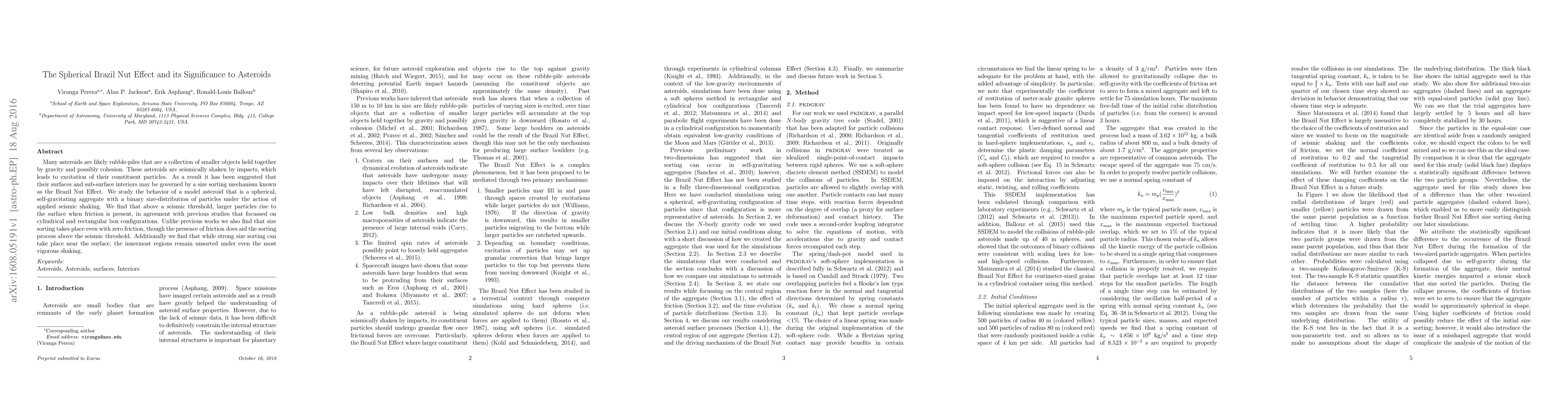 Many asteroids are likely rubble-piles that are a collection of smaller objects held together by gravity and possibly cohesion. These asteroids are seismically shaken by impacts, which leads to excitation of their constituent particles. As a result it has been suggested that their surfaces and sub-surface interiors may be governed by a size sorting mechanism known as the Brazil Nut Effect. We study the behavior of a model asteroid that is a spherical, self-gravitating aggregate with a binary size-distribution of particles under the action of applied seismic shaking. We find that above a seismic threshold, larger particles rise to the surface when friction is present, in agreement with previous studies that focussed on cylindrical and rectangular box configurations. Unlike previous works we also find that size sorting takes place even with zero friction, though the presence of friction does aid the sorting process above the seismic threshold. Additionally we find that while strong size sorting can take place near the surface, the innermost regions remain unsorted under even the most vigorous shaking.