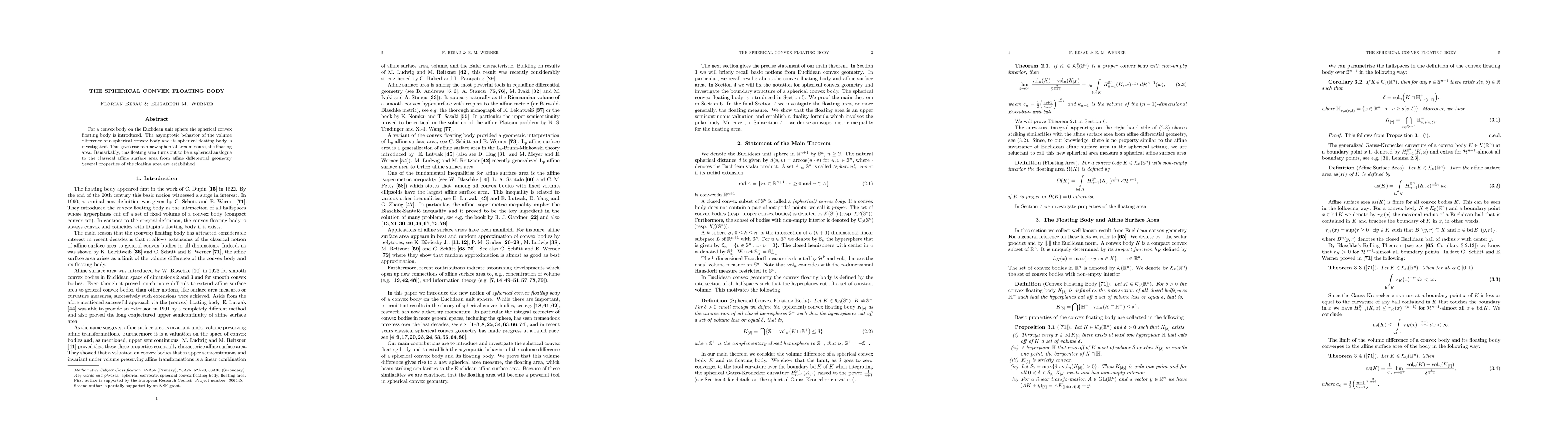 The paper introduces the concept of the spherical convex floating body and investigates its volume difference with the original spherical convex body, establishing a new spherical area measure called the floating area, which parallels the classical affine surface area in affine differential geometry. Various properties of this floating area are also explored.