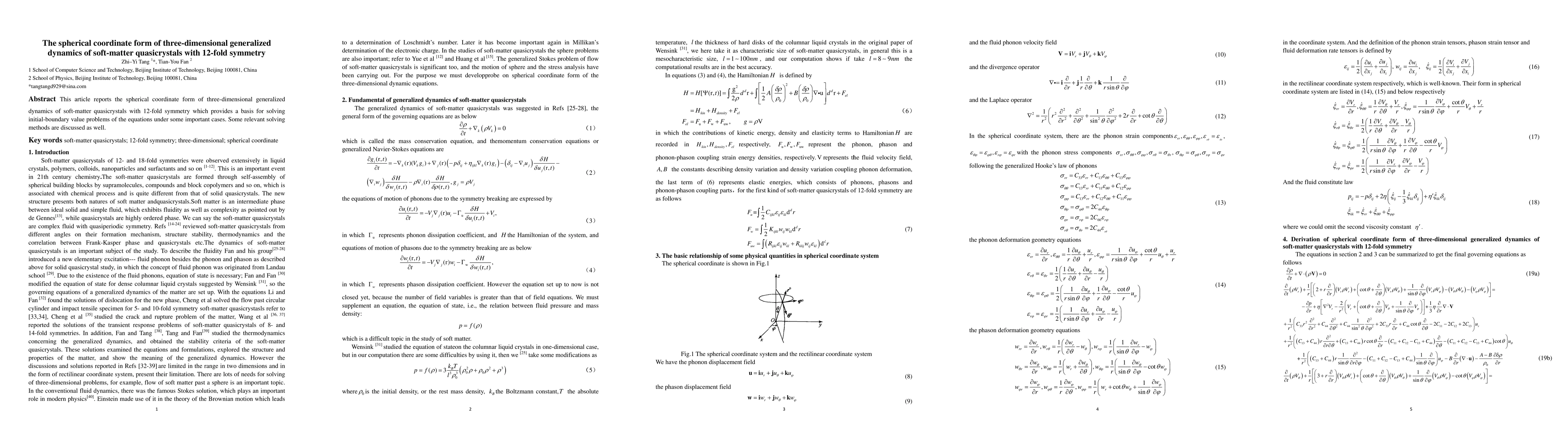 This paper presents a spherical coordinate formulation for the three-dimensional generalized dynamics of soft-matter quasicrystals with 12-fold symmetry, offering a framework for solving initial-boundary value problems and discussing relevant solution methods.