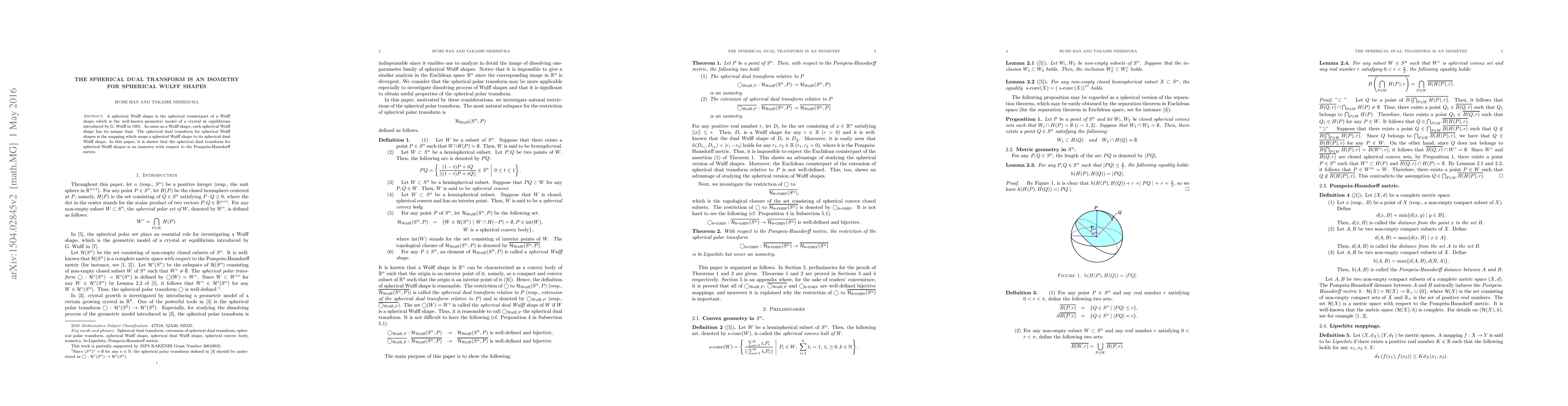 This paper demonstrates that the spherical dual transform, which maps a spherical Wulff shape to its dual, is an isometry concerning the Pompeiu-Hausdorff metric, preserving the shape's geometric properties.
