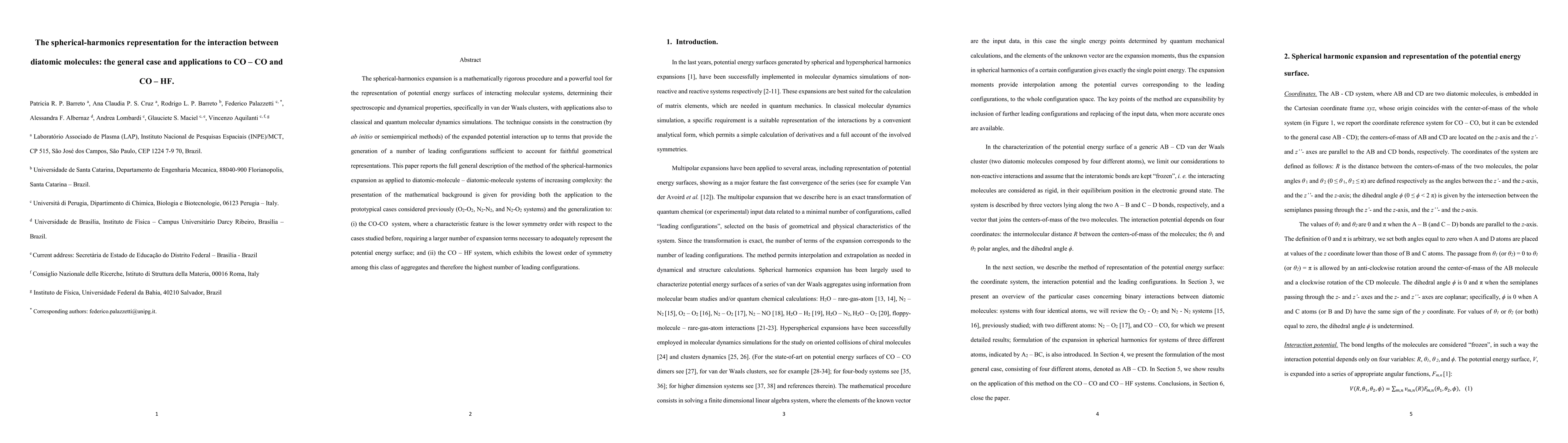 This paper presents a comprehensive method for representing the interaction between diatomic molecules using spherical-harmonics expansion, applied to complex systems like CO-CO and CO-HF. It provides a detailed mathematical framework and demonstrates the necessity of a larger number of expansion terms for systems with lower symmetry.