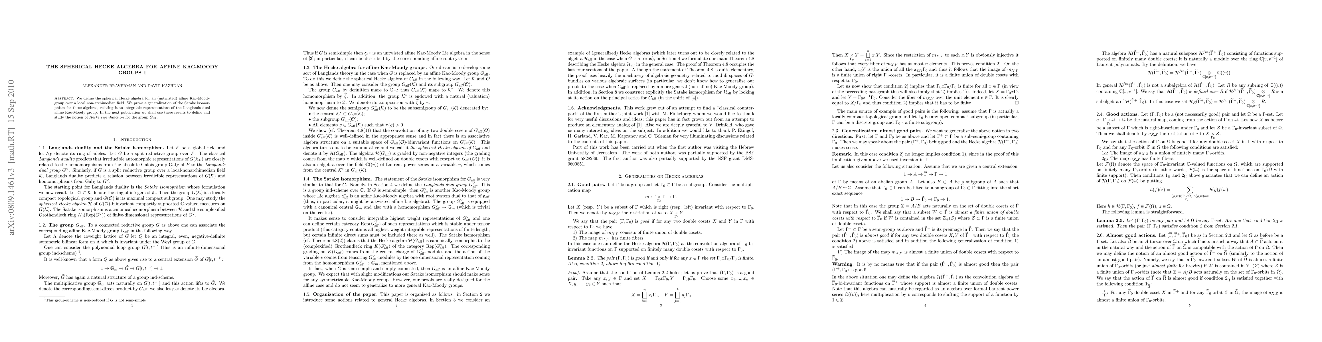 This paper defines the spherical Hecke algebra for affine Kac-Moody groups and proves a generalized Satake isomorphism, linking it to integrable representations of the Langlands dual group. Future work will explore Hecke eigenfunctions for the affine Kac-Moody group.