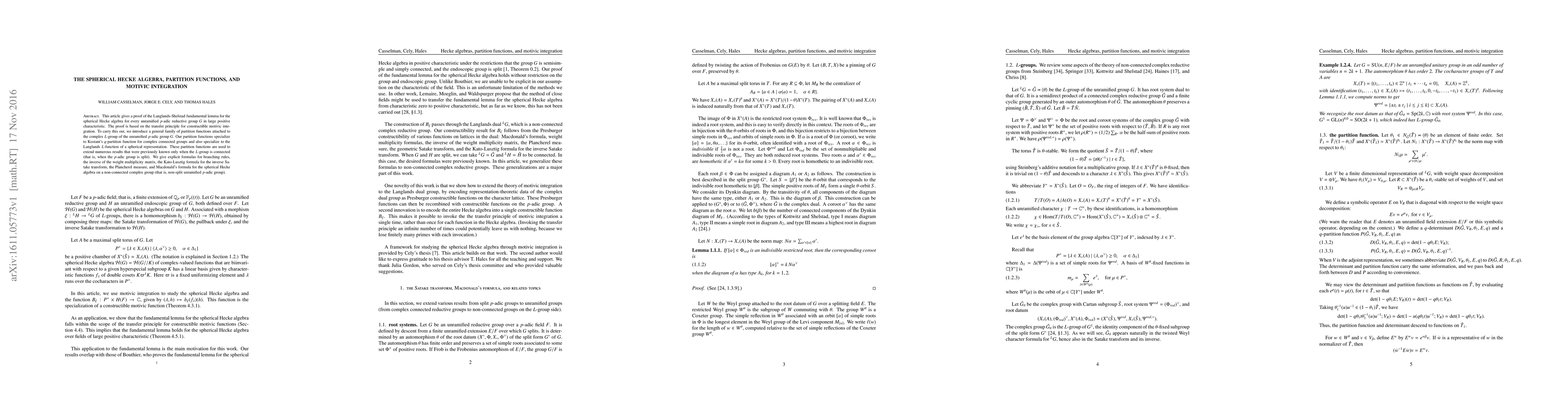 This article gives a proof of the Langlands-Shelstad fundamental lemma for the spherical Hecke algebra for every unramified p-adic reductive group G in large positive characteristic. The proof is based on the transfer principle for constructible motivic integration. To carry this out, we introduce a general family of partition functions attached to the complex L-group of the unramified p-adic group G. Our partition functions specialize to Kostant's q-partition function for complex connected groups and also specialize to the Langlands L-function of a spherical representation. These partition functions are used to extend numerous results that were previously known only when the L-group is connected (that is, when the p-adic group is split). We give explicit formulas for branching rules, the inverse of the weight multiplicity matrix, the Kato-Lusztig formula for the inverse Satake transform, the Plancherel measure, and Macdonald's formula for the spherical Hecke algebra on a non-connected complex group (that is, non-split unramified p-adic group).