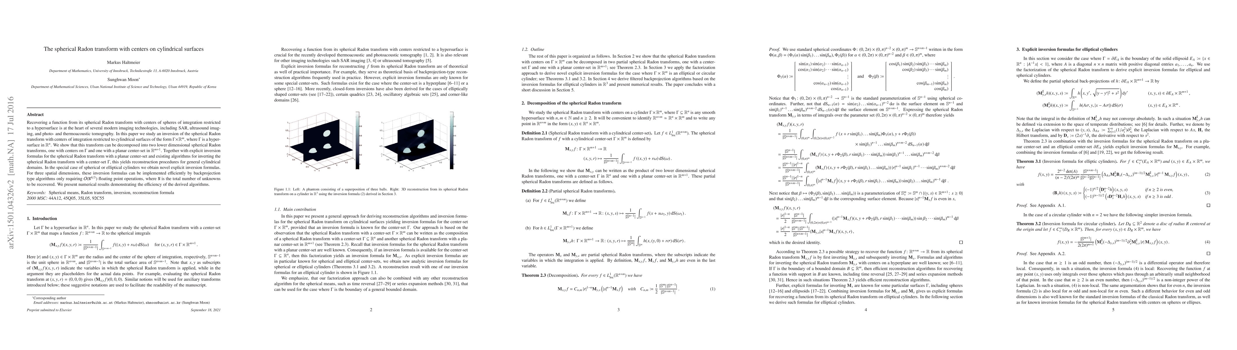 This paper explores the inversion of the spherical mean Radon transform with integration centers on cylindrical surfaces, decomposing it into two lower-dimensional transforms. It provides explicit inversion formulas and efficient algorithms for reconstructing cylindrical domains, especially for spherical or elliptical cylinders, with computational complexity of $\mathcal O(N^{4/3})$.
