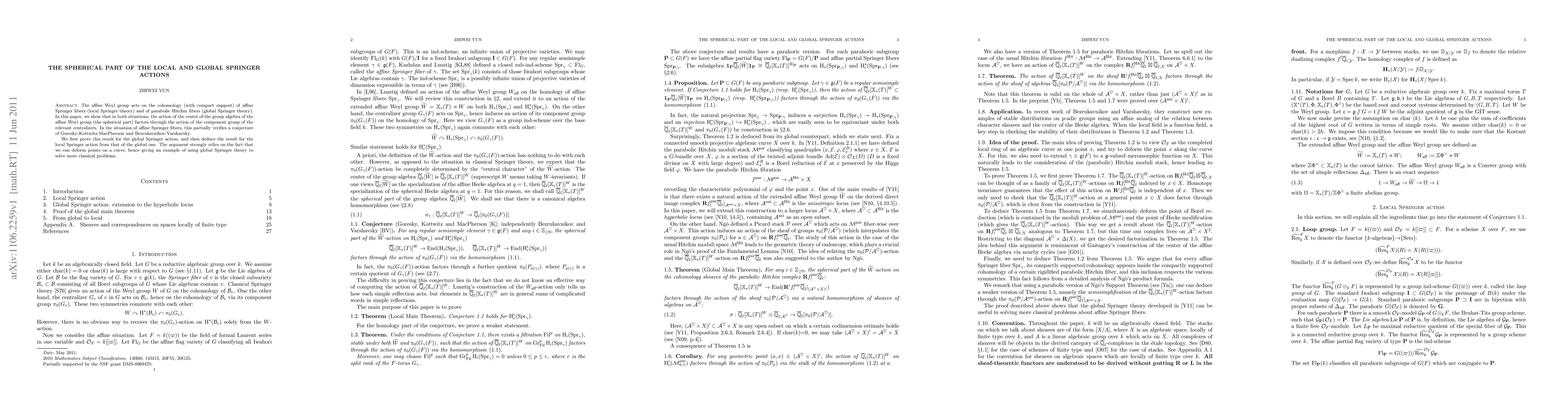 The affine Weyl group acts on the cohomology (with compact support) of affine Springer fibers (local Springer theory) and of parabolic Hitchin fibers (global Springer theory). In this paper, we show that in both situations, the action of the center of the group algebra of the affine Weyl group (the spherical part) factors through the action of the component group of the relevant centralizers. In the situation of affine Springer fibers, this partially verifies a conjecture of Goresky-Kottwitz-MacPherson and Bezrukavnikov-Varshavsky. We first prove this result for the global Springer action, and then deduce the result for the local Springer action from that of the global one. The argument strongly relies on the fact that we can deform points on a curve, hence giving an example of using global Springer theory to solve more classical problems.