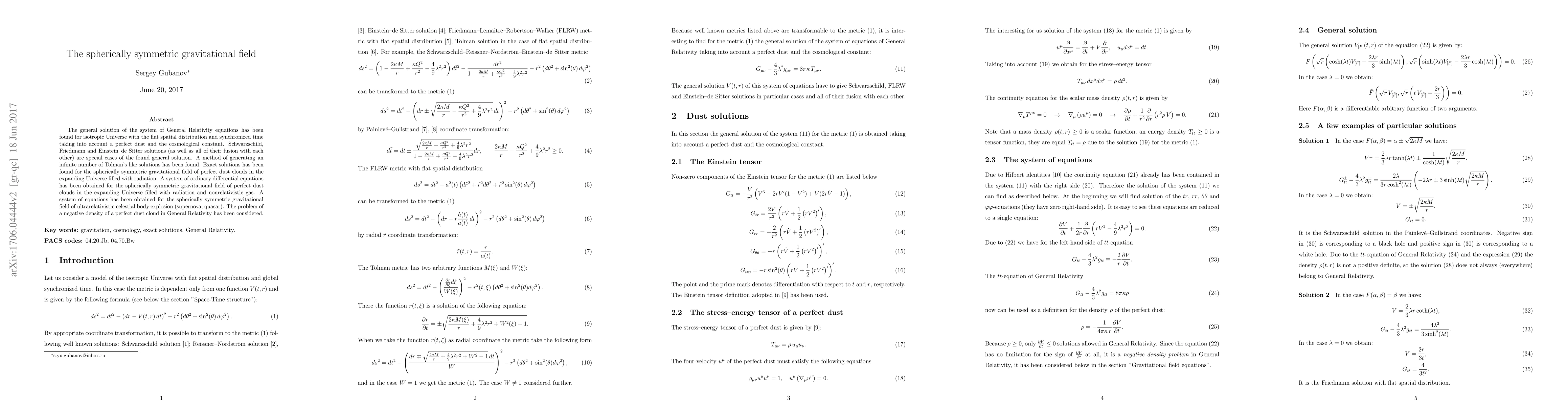 The general solution of the system of General Relativity equations has been found for isotropic Universe with the flat spatial distribution and synchronized time taking into account a perfect dust and the cosmological constant. Schwarzschild, Friedmann and Einstein-de Sitter solutions (as well as all of their fusion with each other) are special cases of the found general solution. A method of generating an infinite number of Tolman's like solutions has been found. Exact solutions has been found for the spherically symmetric gravitational field of perfect dust clouds in the expanding Universe filled with radiation. A system of ordinary differential equations has been obtained for the spherically symmetric gravitational field of perfect dust clouds in the expanding Universe filled with radiation and nonrelativistic gas. A system of equations has been obtained for the spherically symmetric gravitational field of ultrarelativistic celestial body explosion (supernova, quasar). The problem of a negative density of a perfect dust cloud in General Relativity has been considered.