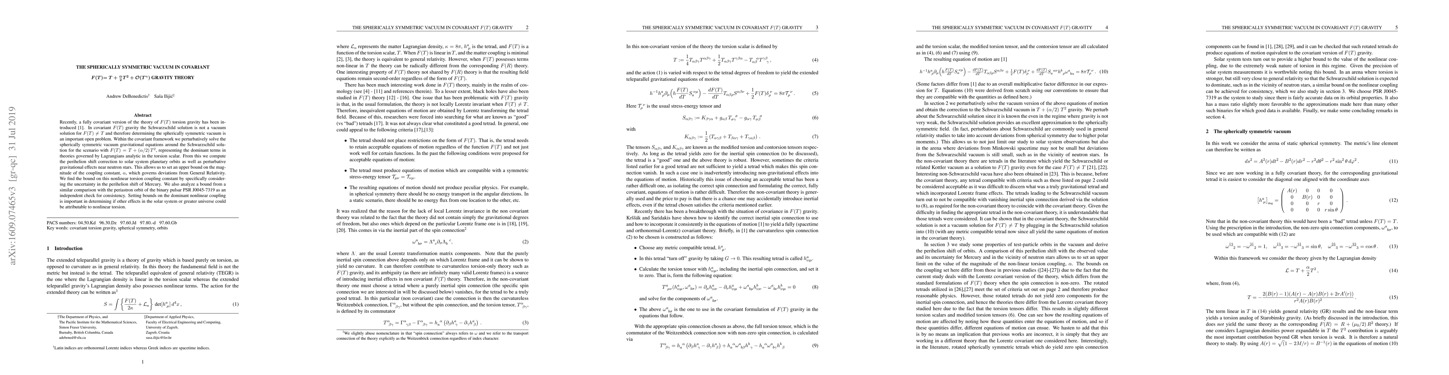 This paper presents a perturbative solution for the spherically symmetric vacuum in covariant $F(T) = T + rac{alpha}{2}T^{2} + mathcal{O}(T^{gamma})$ gravity theory around the Schwarzschild solution. It calculates perihelion shift corrections for solar system planets and gravitational effects near neutron stars, setting an upper bound on the coupling constant $alpha$ using Mercury's perihelion shift uncertainty and an independent check from the binary pulsar PSR J0045-7319.
