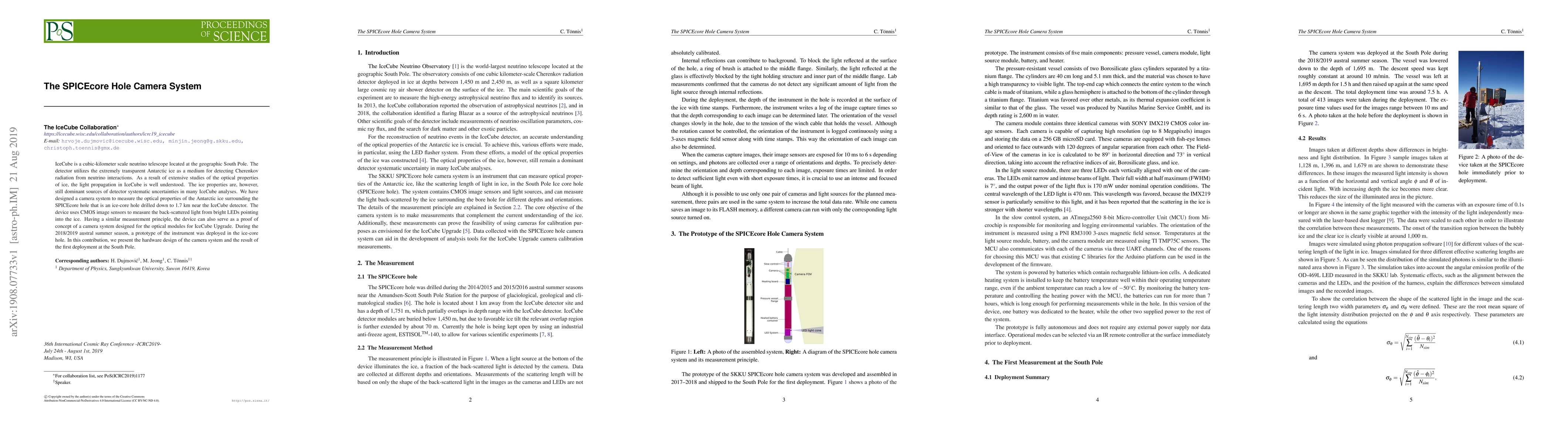 The SPICEcore Hole Camera System is designed to measure the optical properties of Antarctic ice near the IceCube neutrino telescope, using CMOS sensors to capture back-scattered light from LEDs. The prototype was deployed in the 2018/2019 austral summer, providing initial data on ice transparency and serving as a proof of concept for future IceCube Upgrade modules.
