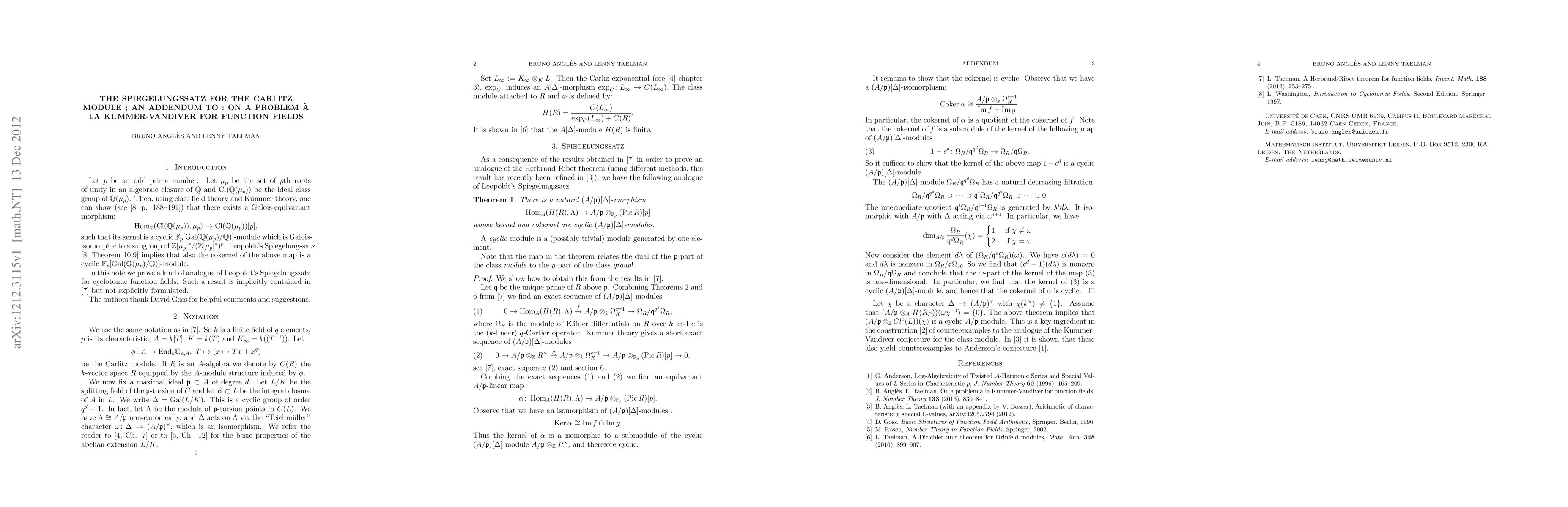 In this addendum to arXiv:1110.0292 we prove a function field analogue of the Spiegelungssatz. It provides a relation between the Galois module structure of the class group of a cyclotomic function field, and the Galois module structure of the class module introduced by the second author. The result is already implicit in earlier work of the authors, but not stated explicitly.