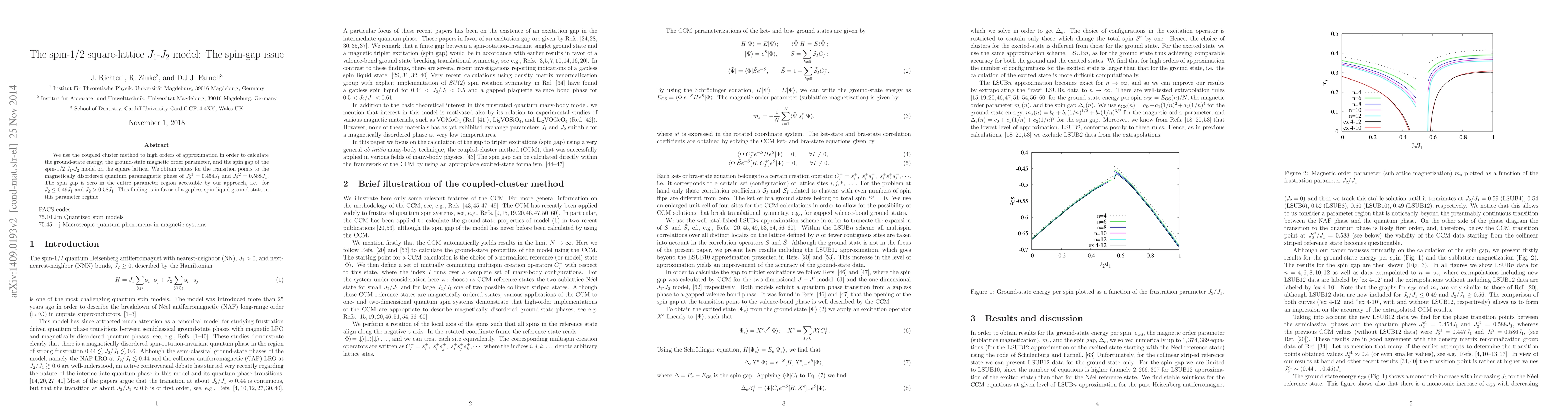 We use the coupled cluster method to high orders of approximation in order to calculate the ground-state energy, the ground-state magnetic order parameter, and the spin gap of the spin-1/2 J_1-J_2 model on the square lattice. We obtain values for the transition points to the magnetically disordered quantum paramagnetic phase of J_2^{c1}=0.454J_1 and J_2^{c2}= 0.588 J_1. The spin gap is zero in the entire parameter region accessible by our approach, i.e. for J_2 \le 0.49J_1 and J_2 > 0.58J_1. This finding is in favor of a gapless spin-liquid ground state in this parameter regime.