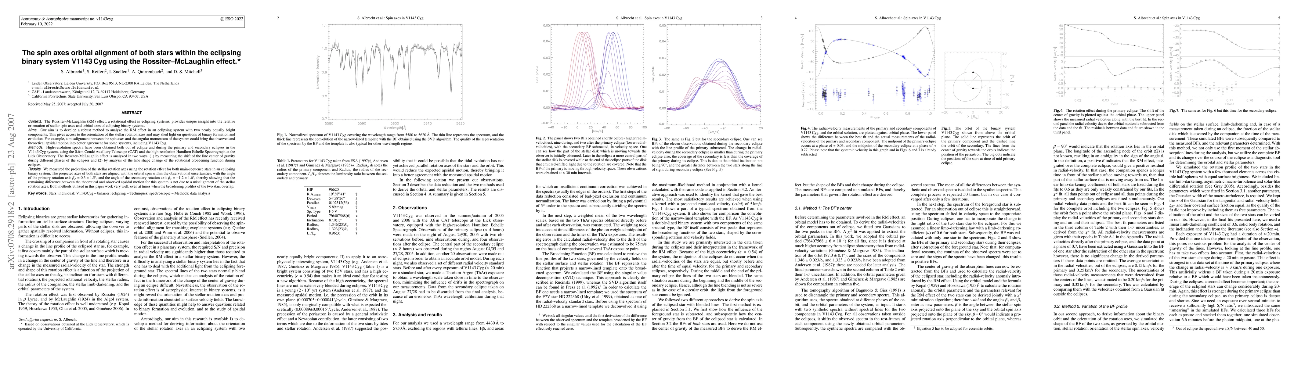 Context: The Rossiter-McLaughlin (RM) effect, a rotational effect in eclipsing systems, provides unique insight into the relative orientation of stellar spin axes and orbital axes of eclipsing binary systems. Aims: Our aim is to develop a robust method to analyze the RM effect in an eclipsing system with two nearly equally bright components. This gives access to the orientation of the stellar rotation axes and may shed light on questions of binary formation and evolution. Methods: High-resolution spectra have been obtained both out of eclipse and during the primary and secondary eclipses in the V1143Cyg system, using the high-resolution Hamilton Echelle Spectrograph at the Lick Observatory. The Rossiter-McLaughlin effect is analyzed in two ways: (1) by measuring the shift of the line center of gravity during different phases of the eclipses and (2) by analysis of the line shape change of the rotational broadening function during eclipses. Results: The projected axes of both stars are aligned with the orbital spin within the observational uncertainties, with the angle of the primary rotation axis beta_p=0.3+-1.5 deg, and the angle of the secondary rotation axis beta_s=-1.2+-1.6 deg, thereby showing that the remaining difference between the theoretical and observed apsidal motion for this system is not due to a misalignment of the stellar rotation axes. Both methods utilized in this paper work very well, even at times when the broadening profiles of the two stars overlap.[abridged]