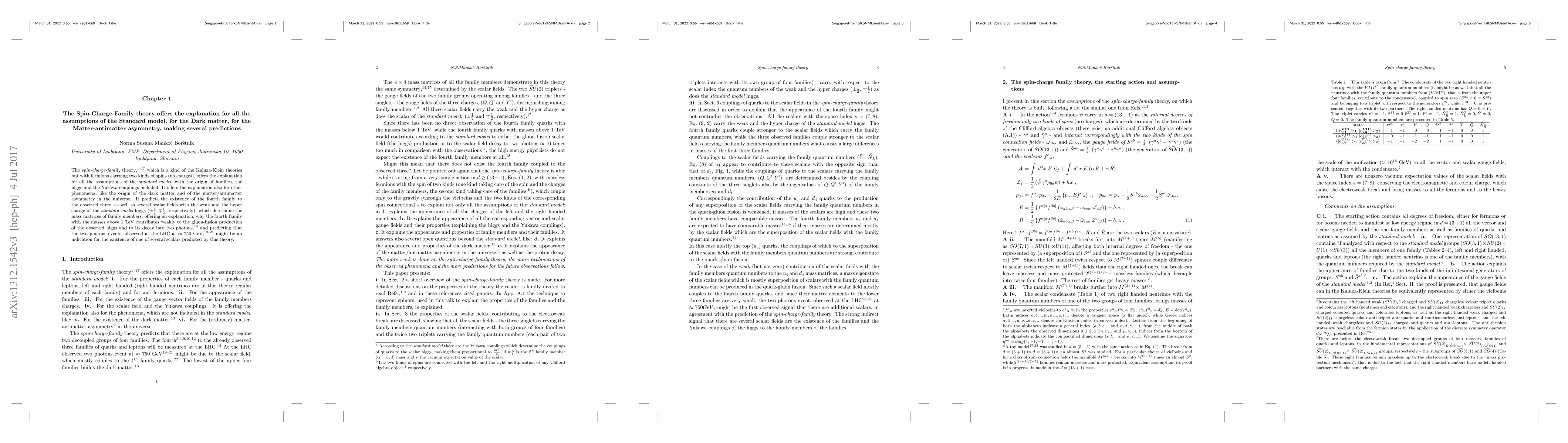 The spin-charge-family theory, a variant of Kaluza-Klein theories, explains the Standard Model, dark matter, and matter-antimatter asymmetry, predicting a fourth family of particles and several scalar fields. It suggests the observed 750 GeV two-photon events at the LHC may indicate one of these scalars.