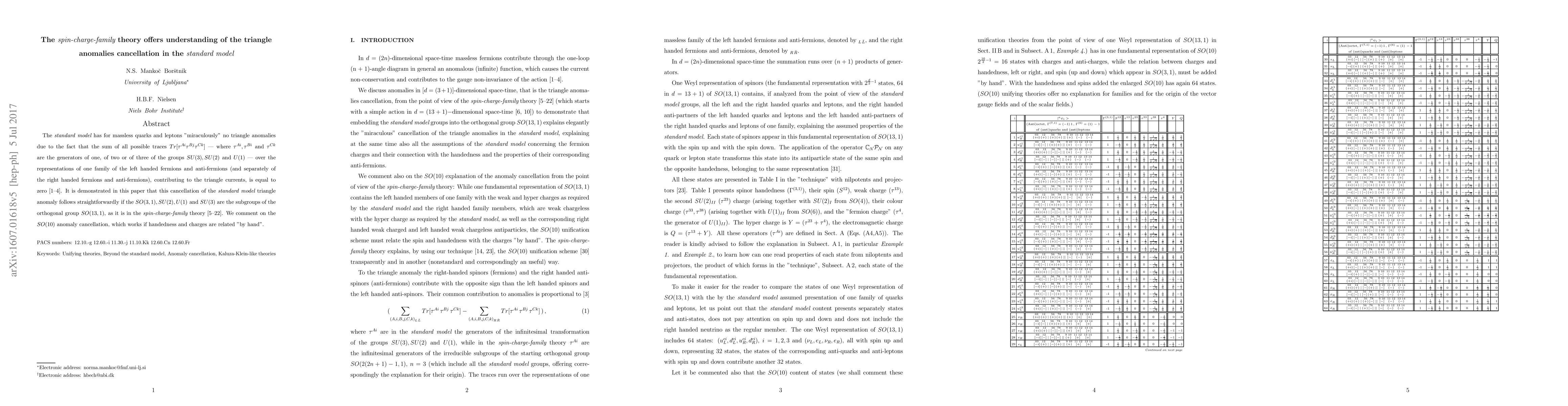 The standard model has for massless quarks and leptons "miraculously" no triangle anomalies due to the fact that the sum of all possible traces $Tr [\tau^{Ai}$$ \tau^{Bj}$$ \tau^{Ck}]$ --- where $\tau^{Ai}, \tau^{Bi}$ and $\tau^{Ck}$ are the generators of one, of two or of three of the groups $SU(3), SU(2)$ and $U(1)$ --- over the representations of one family of the left handed fermions and anti-fermions (and separately of the right handed fermions and anti-fermions), contributing to the triangle currents, is equal to zero. It is demonstrated in this paper that this cancellation of the standard model triangle anomaly follows straightforwardly if the $SO(3,1), SU(2), U(1)$ and $ SU(3)$ are the subgroups of the orthogonal group $SO(13,1)$, as it is in the spin-charge-family theory. We comment on the $SO(10)$ anomaly cancellation, which works if handedness and charges are related "by hand".