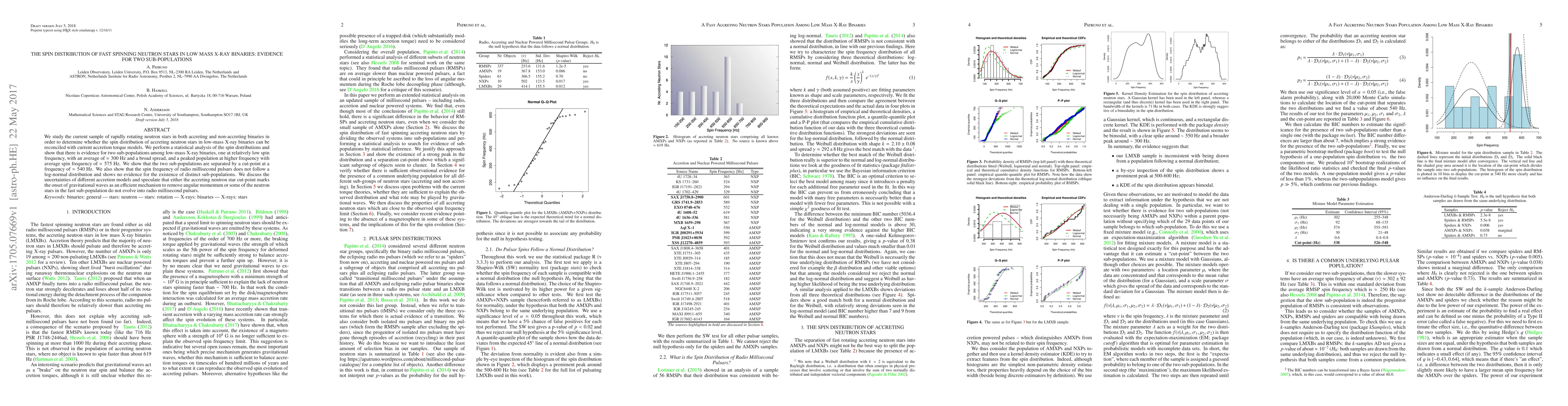 This paper investigates the spin distribution of rapidly rotating neutron stars in low-mass X-ray binaries, revealing evidence for two distinct sub-populations: one at ~300 Hz and another peaked at ~575 Hz, separated by a cut-point at ~540 Hz. The study also finds that radio millisecond pulsars do not follow a log-normal distribution and suggests possible mechanisms for the observed separation.