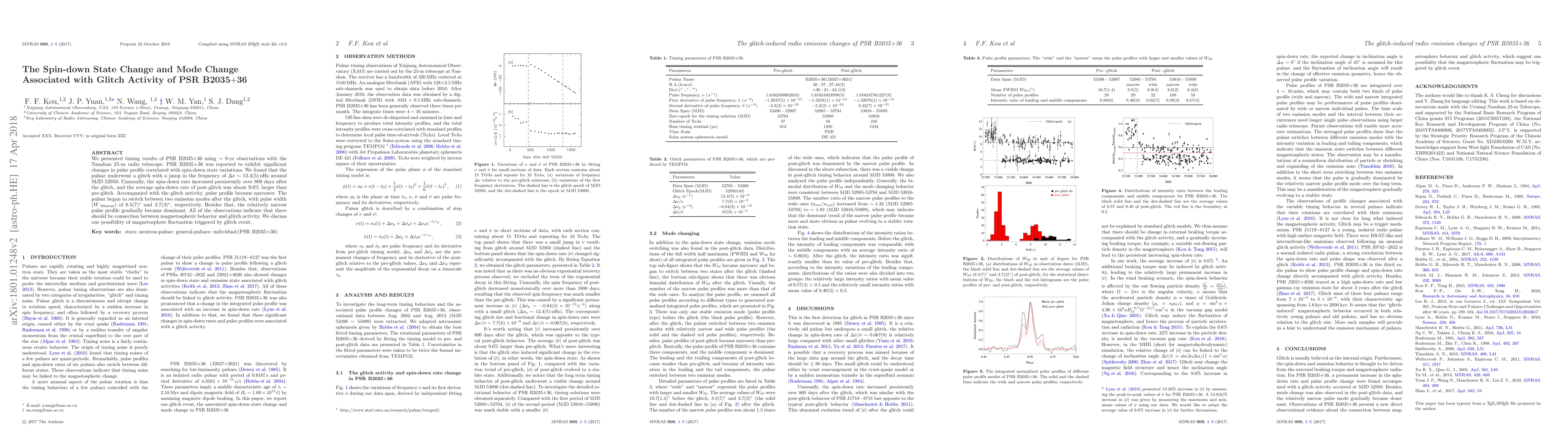 We presented timing results of PSR B2035+36 using ~9-yr observations with the Nanshan 25-m radio telescope. PSR B2035+36 was reported to exhibit significant changes in pulse profile correlated with spin-down state variations. We found that the pulsar underwent a glitch with a jump in the frequency of $\Delta{\nu}\sim12.4(5)\, \rm nHz$ around MJD 52950. Unusually, the spin-down rate increased persistently over $800$ days after the glitch, and the average spin-down rate of post-glitch was about $9.6\%$ larger than pre-glitch. Accompanied with the glitch activity, pulse profile became narrower. The pulsar began to switch between two emission modes after the glitch, with pulse width ($W_{\ 50 \rm mean}$) of $8.5(7)^{\circ}$ and $3.7(3)^{\circ}$, respectively. Besides that, the relatively narrow pulse profile gradually became dominant. All of the observations indicate that there should be connection between magnetospheric behavior and glitch activity. We discuss one possibility of magnetosphere fluctuation triggered by glitch event.
