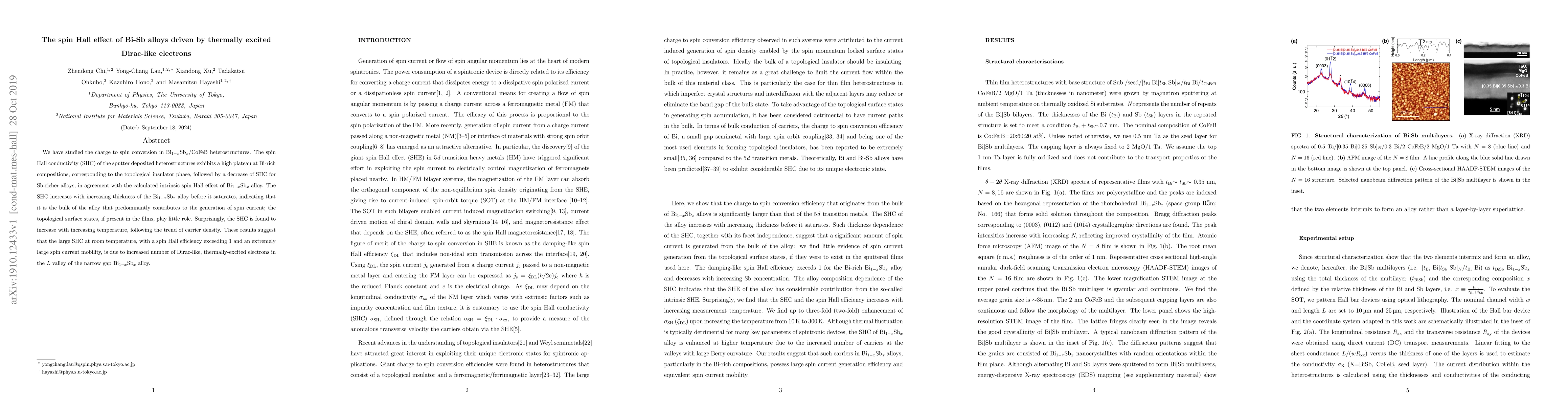 This study investigates the spin Hall effect in Bi$_{1-x}$Sb$_x$/CoFeB heterostructures, finding that the spin Hall conductivity plateaus at high Bi content, linked to the topological insulator phase. The effect is driven by thermally excited Dirac-like electrons, with the spin Hall conductivity increasing with temperature due to rising carrier density.