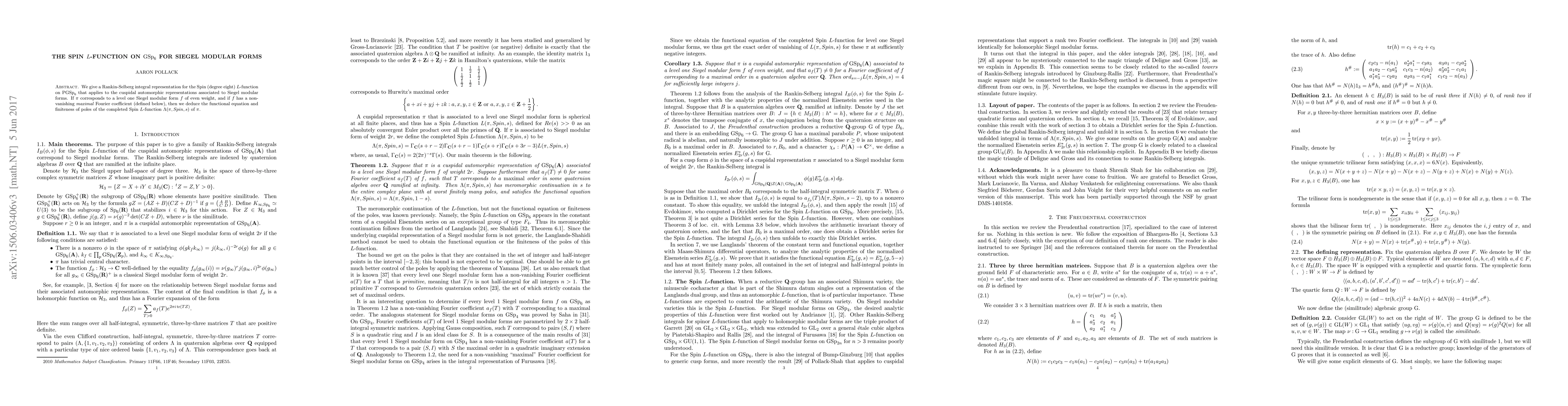 We give a Rankin-Selberg integral representation for the Spin (degree eight) $L$-function on $\mathrm{PGSp}_6$. The integral applies to the cuspidal automorphic representations associated to Siegel modular forms. If $\pi$ corresponds to a level one Siegel modular form $f$ of even weight, and if $f$ has a non-vanishing maximal Fourier coefficient (defined below), then we deduce the functional equation and finiteness of poles of the completed Spin $L$-function $\Lambda(\pi,Spin,s)$ of $\pi$.