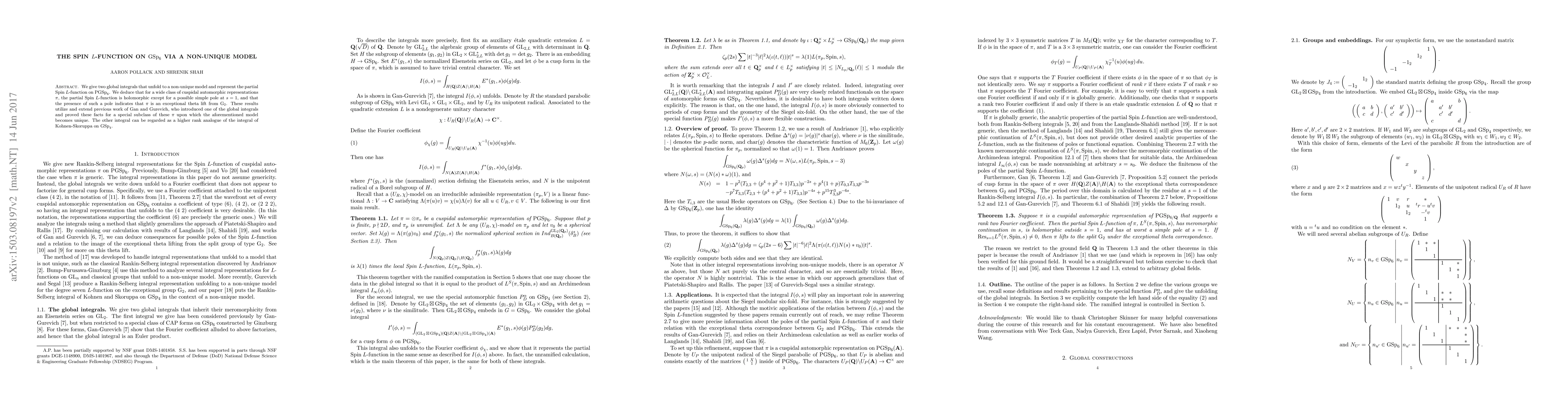 We give two global integrals that unfold to a non-unique model and represent the partial Spin $L$-function on $\mathrm{GSp}_6$. We deduce that for a wide class of cuspidal automorphic representations $\pi,$ the partial Spin $L$-function is holomorphic except for a possible simple pole at $s=1$, and that the presence of such a pole indicates that $\pi$ is an exceptional theta lift from $\mathrm{G}_2$. These results utilize and extend previous work of Gan and Gurevich, who introduced one of the global integrals and proved these facts for a special subclass of these $\pi$ upon which the aforementioned model becomes unique. The other integral can be regarded as a higher rank analogue of the integral of Kohnen-Skoruppa on $\mathrm{GSp}_4$.