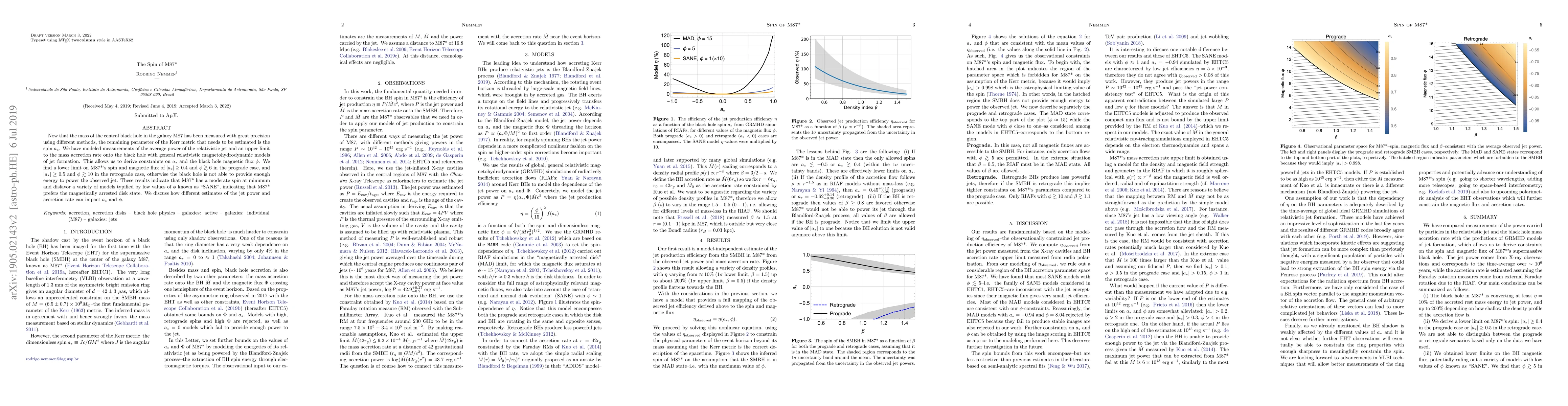 Now that the mass of the central black hole in the galaxy M87 has been measured with great precision using different methods, the remaining parameter of the Kerr metric that needs to be estimated is the spin a*. We have modeled measurements of the average power of the relativistic jet and an upper limit to the mass accretion rate onto the black hole with general relativistic magnetohydrodynamic models of jet formation. This allows us to derive constraints on a* and the black hole magnetic flux phi. We find a lower limit on M87*'s spin and magnetic flux of a* > 0.4 and phi > 6 in the prograde case, and a* > 0.5 and phi > 10 in the retrograde case, otherwise the black hole is not able to provide enough energy to power the observed jet. These results indicate that M87* has a moderate spin at minimum and disfavor a variety of models typified by low values of phi known as ``SANE'', indicating that M87* prefers the magnetically arrested disk state. We discuss how different estimates of the jet power and accretion rate can impact a* and phi.