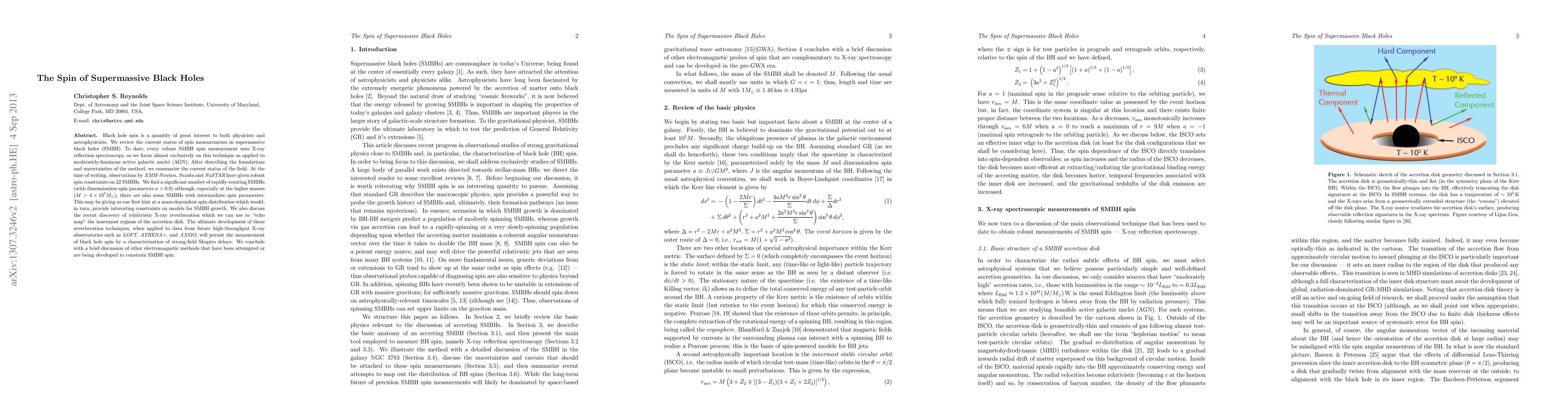 Black hole spin is a quantity of great interest to both physicists and astrophysicists. We review the current status of spin measurements in supermassive black holes (SMBH). To date, every robust SMBH spin measurement uses X-ray reflection spectroscopy, so we focus almost exclusively on this technique as applied to moderately-luminous active galactic nuclei (AGN). After describing the foundations and uncertainties of the method, we summarize the current status of the field. At the time of writing, observations by XMM-Newton, Suzaku and NuSTAR have given robust spin constraints on 22 SMBHs. We find a significant number of rapidly-rotating SMBHs (with dimensionless spin parameters a>0.9) although, especially at the higher masses (M>4*10^7Msun), there are also some SMBHs with intermediate spin parameters. This may be giving us our first hint at a mass-dependent spin distribution which would, in turn, provide interesting constraints on models for SMBH growth. We also discuss the recent discovery of relativistic X-ray reverberation which we can use to "echo map" the innermost regions of the accretion disk. The ultimate development of these reverberation techniques, when applied to data from future high-throughput X-ray observatories such as LOFT, ATHENA+, and AXSIO, will permit the measurement of black hole spin by a characterization of strong-field Shapiro delays. We conclude with a brief discussion of other electromagnetic methods that have been attempted or are being developed to constrain SMBH spin.
