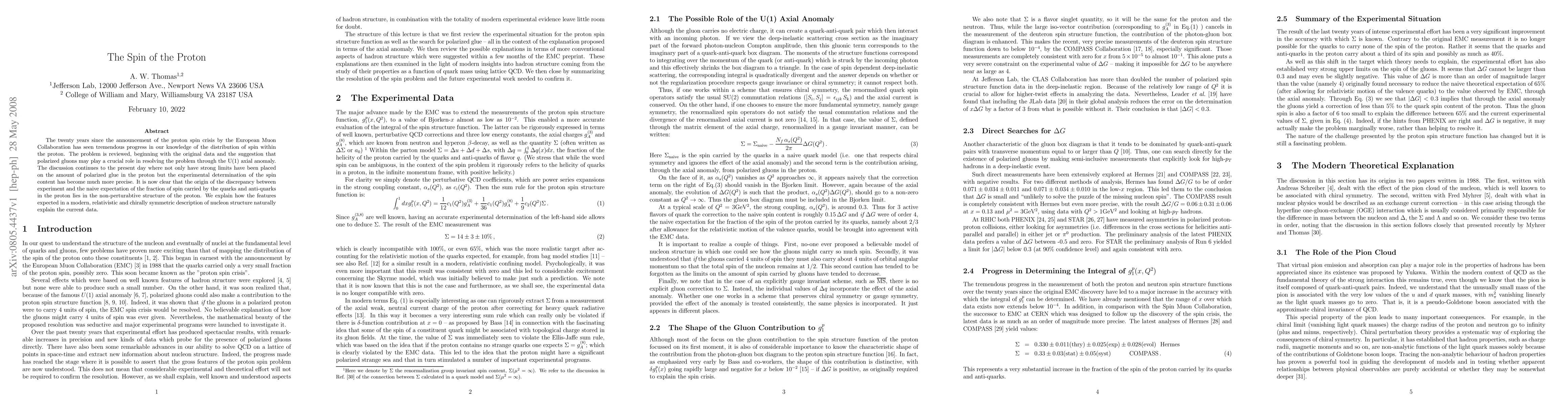 The twenty years since the announcement of the proton spin crisis by the European Muon Collaboration has seen tremendous progress in our knowledge of the distribution of spin within the proton. The problem is reviewed, beginning with the original data and the suggestion that polarized gluons may play a crucial role in resolving the problem through the U(1) axial anomaly. The discussion continues to the present day where not only have strong limits have been placed on the amount of polarized glue in the proton but the experimental determination of the spin content has become much more precise. It is now clear that the origin of the discrepancy between experiment and the naive expectation of the fraction of spin carried by the quarks and anti-quarks in the proton lies in the non-perturabtive structure of the proton. We explain how the features expected in a modern, relativistic and chirally symmetric description of nucleon structure naturally explain the current data.