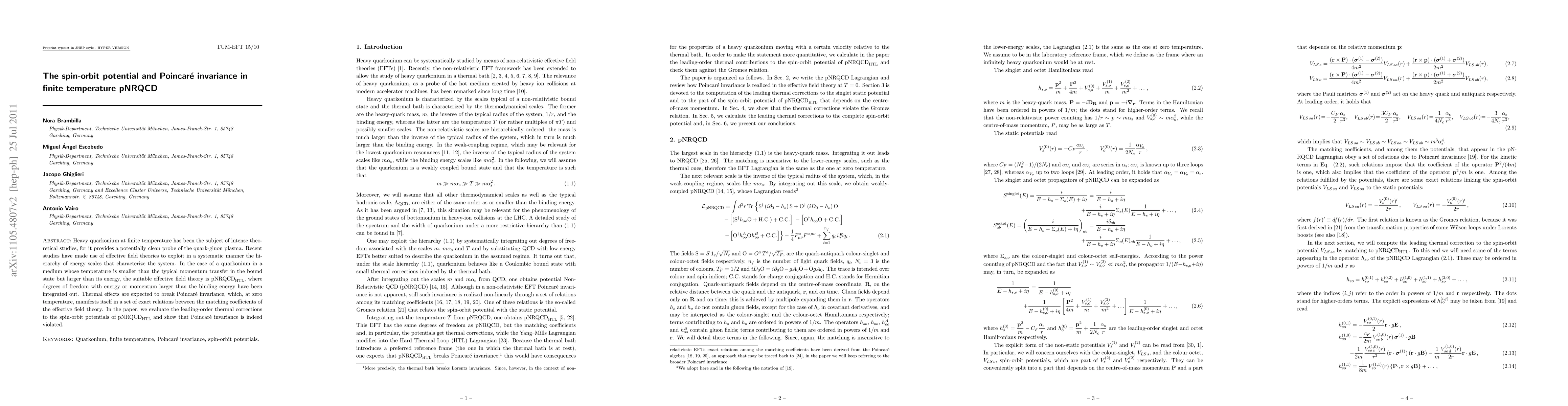 Heavy quarkonium at finite temperature has been the subject of intense theoretical studies, for it provides a potentially clean probe of the quark-gluon plasma. Recent studies have made use of effective field theories to exploit in a systematic manner the hierarchy of energy scales that characterize the system. In the case of a quarkonium in a medium whose temperature is smaller than the typical momentum transfer in the bound state but larger than its energy, the suitable effective field theory is pNRQCD_HTL, where degrees of freedom with energy or momentum larger than the binding energy have been integrated out. Thermal effects are expected to break Poincar\'e invariance, which, at zero temperature, manifests itself in a set of exact relations between the matching coefficients of the effective field theory. In the paper, we evaluate the leading-order thermal corrections to the spin-orbit potentials of pNRQCD_HTL and show that Poincar\'e invariance is indeed violated.