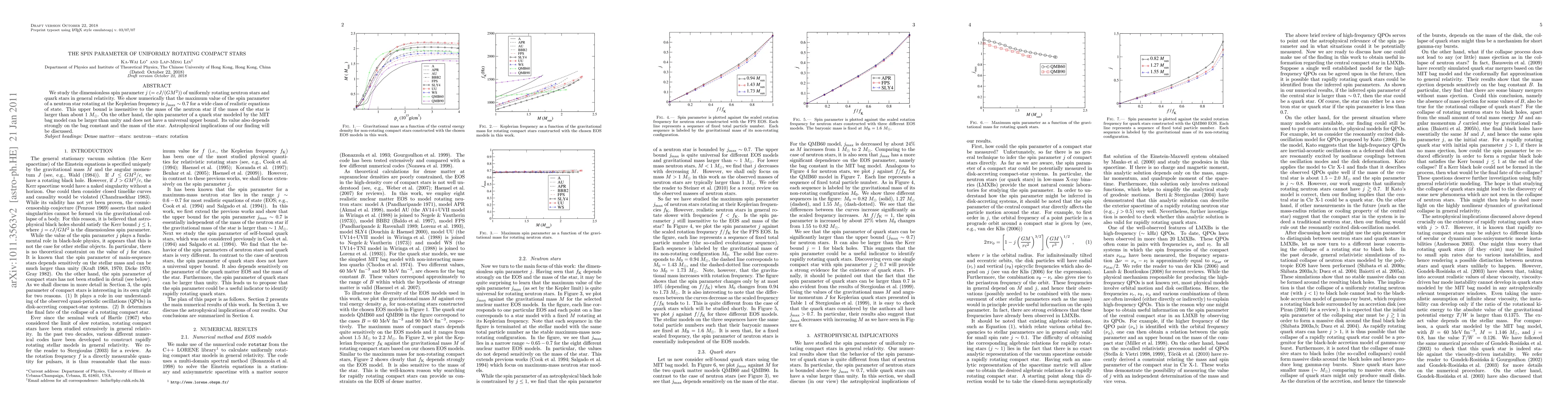 This paper investigates the spin parameter of uniformly rotating neutron and quark stars in general relativity, finding that neutron stars have a maximum spin parameter of approximately 0.7, while quark stars can exceed a spin parameter of 1, depending on the bag constant and mass.