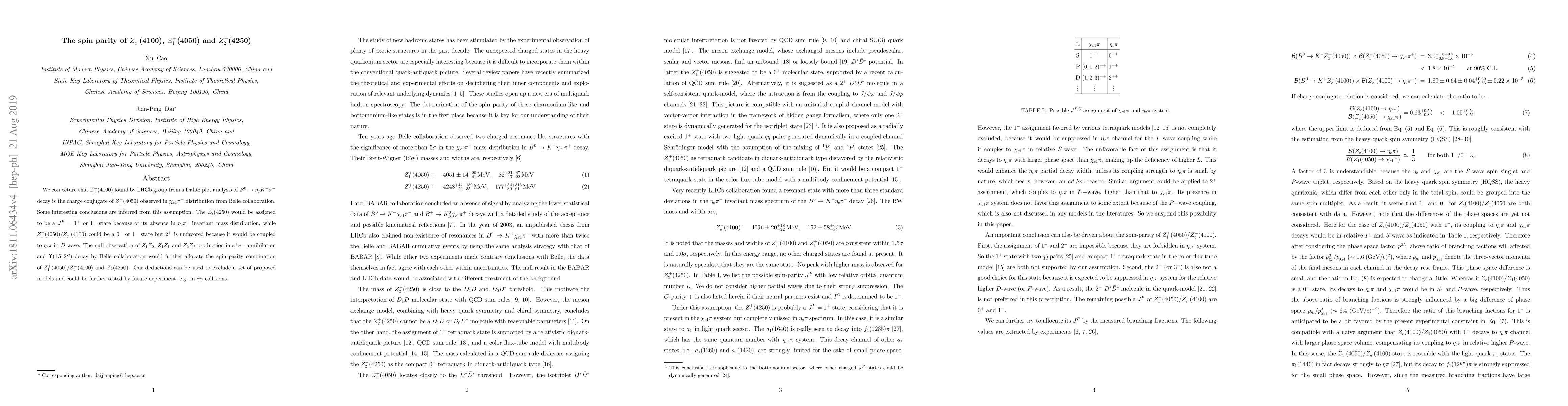 We conjecture that $Z_c^-$(4100) found by LHCb group from a Dalitz plot analysis of $B^0\to \eta_c K^+\pi^-$ decay is the charge conjugate of $Z_1^+$(4050) observed in $\chi_{c1}\pi^+$ distribution from Belle collaboration. Some interesting conclusions are inferred from this assumption. The $Z_2$(4250) would be assigned to be a $J^P = 1^+$ or $1^-$ state because of its absence in $\eta_{c}\pi^-$ invariant mass distribution, while $Z_1^+$(4050)/$Z_c^-$(4100) could be a $0^+$ or $1^-$ state but $2^+$ is unfavored because it would be coupled to $\eta_{c}\pi$ in $D$-wave. The null observation of $Z_1 Z_2$, $Z_1 Z_1$ and $Z_2 Z_2$ production in $e^+ e^-$ annihilation and $\Upsilon(1S,2S)$ decay by Belle collaboration would further allocate the spin parity combination of $Z_1^+$(4050)/$Z_c^-$(4100) and $Z_2$(4250). Our deductions can be used to exclude a set of proposed models and could be further tested by future experiment, e.g. in $\gamma \gamma$ collisions.