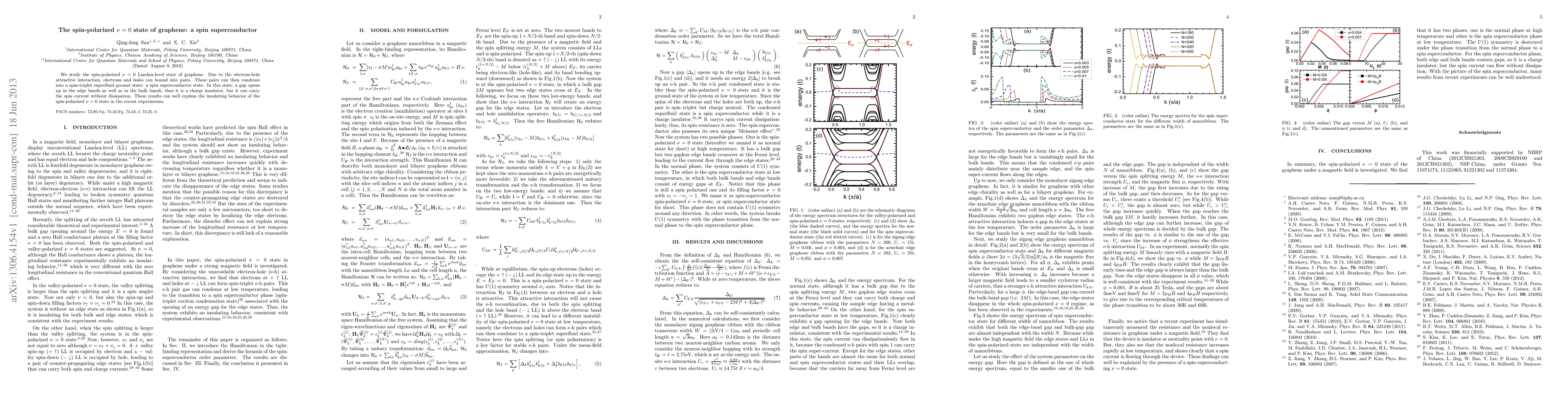 This paper explores the spin-polarized $\nu=0$ Landau-level state in graphene, revealing that electron-hole pairs form a spin-triplet superfluid, resulting in a spin superconducting state. This state exhibits insulating behavior while allowing spin current flow without dissipation, aligning with recent experimental observations.