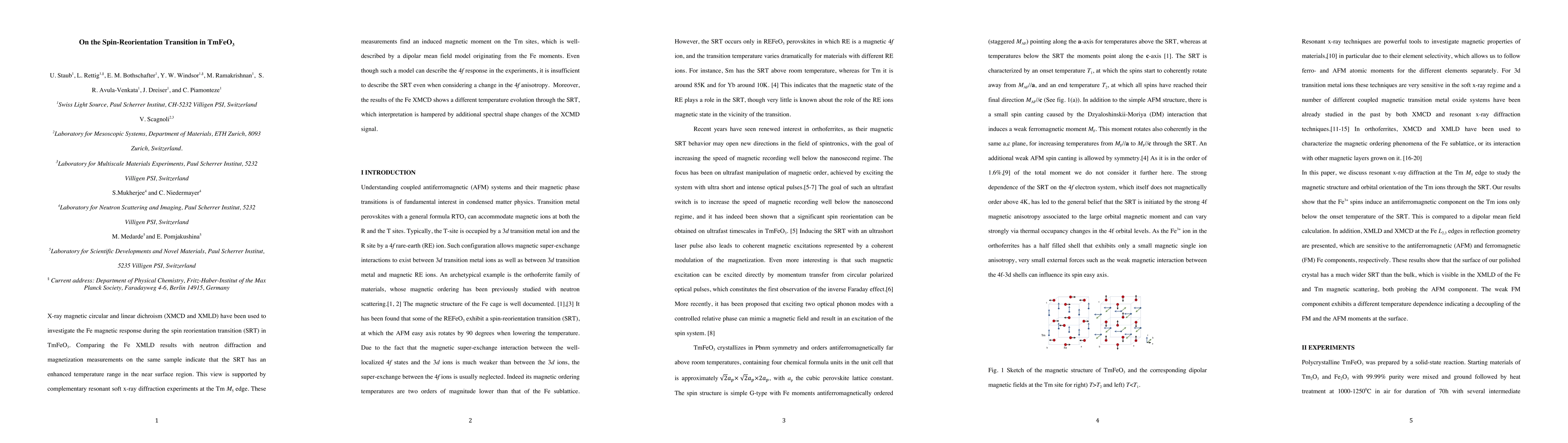 X-ray magnetic circular and linear dichroism (XMCD and XMLD) have been used to investigate the Fe magnetic response during the spin reorientation transition (SRT) in TmFeO3. These experiments are complemented with resonant magnetic diffraction experiments at the Tm M5 edge to study simultaneously the induced magnetic order in the Tm 4f shell and the behavior of the Tm orbitals through the SRT. Comparing the Fe XMLD results with neutron diffraction and magnetization measurements on the same sample indicate that the SRT has an enhanced temperature range in the near surface region. This view is supported by the resonant soft x-ray diffraction results at the Tm M5 edge. These find an induced magnetic moment on the Tm sites, which is well-described by a dipolar mean field model originating from the Fe moments. Even though such a model can describe the 4f response in the experiments, it is insufficient to describe the SRT even when considering a change in the 4f anisotropy. Moreover, the results of the Fe XMCD are indicative of a decoupling of spin canting and antiferromagnetic spin rotation in the near surface regime close to the SRT, which remains to be understood.