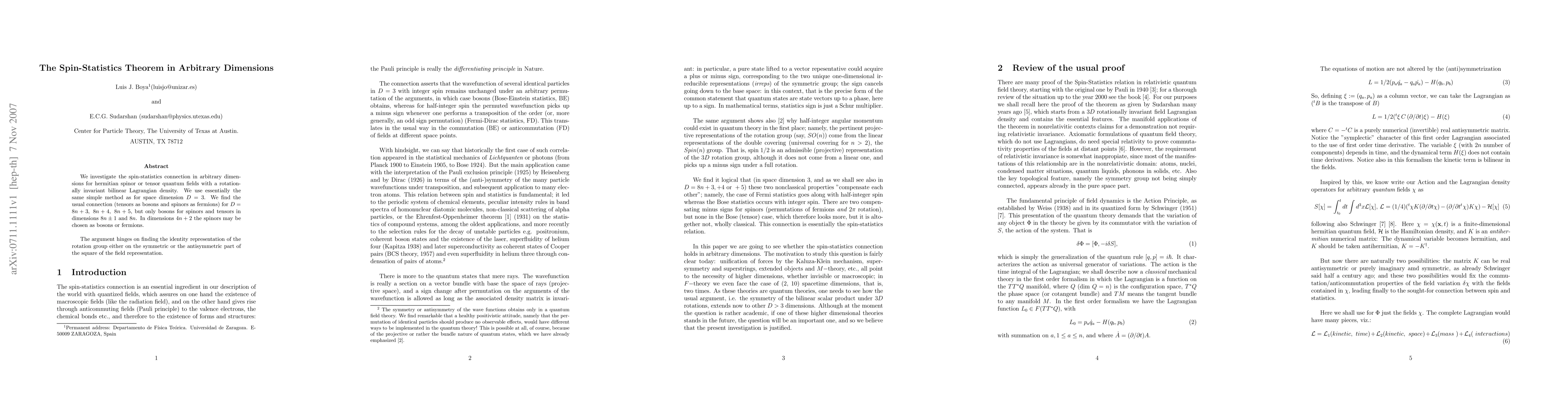 This paper explores the spin-statistics theorem in various dimensions, confirming the usual boson-fermion distinction for dimensions 8n + 3, 8n + 4, and 8n + 5, while revealing only bosonic behavior for spinors and tensors in dimensions 8n ± 1 and 8n. In dimensions 4n + 2, spinors can be treated as either bosons or fermions, depending on the field representation.