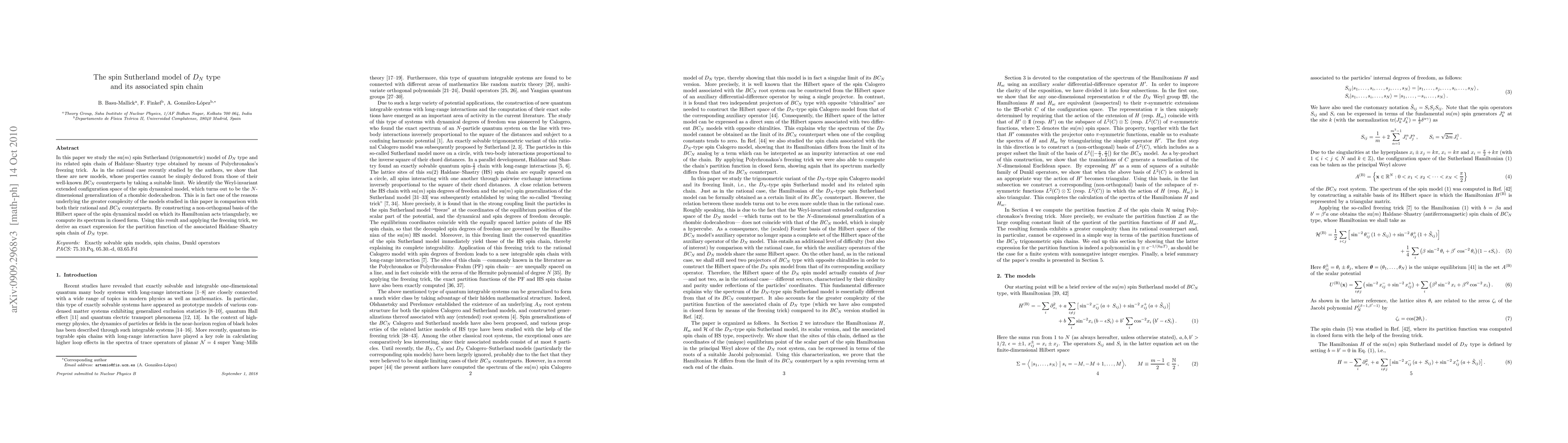 In this paper we study the su(m) spin Sutherland (trigonometric) model of D_N type and its related spin chain of Haldane-Shastry type obtained by means of Polychronakos's freezing trick. As in the rational case recently studied by the authors, we show that these are new models, whose properties cannot be simply deduced from those of their well-known BC_N counterparts by taking a suitable limit. We identify the Weyl-invariant extended configuration space of the spin dynamical model, which turns out to be the N-dimensional generalization of a rhombic dodecahedron. This is in fact one of the reasons underlying the greater complexity of the models studied in this paper in comparison with both their rational and BC_N counterparts. By constructing a non-orthogonal basis of the Hilbert space of the spin dynamical model on which its Hamiltonian acts triangularly, we compute its spectrum in closed form. Using this result and applying the freezing trick, we derive an exact expression for the partition function of the associated Haldane-Shastry spin chain of D_N type.